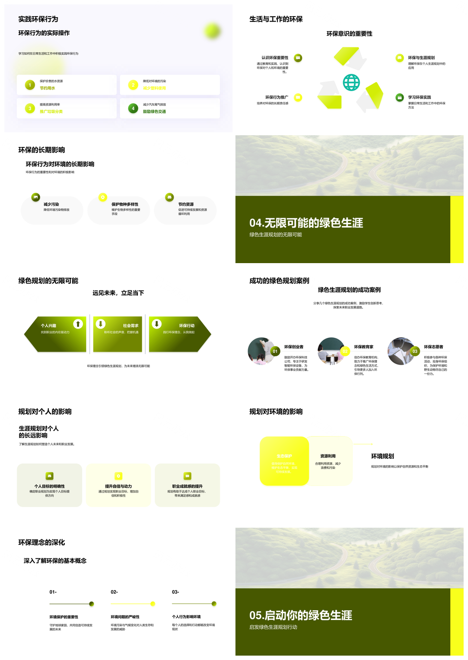 这是一张环保教育兴趣导向绿色生涯规划PPT模板,包含环保教育、兴趣导向、绿色生涯规划等主题内容,也可用作环保教育兴趣导向、教育兴趣导向绿色、兴趣导向绿色生涯、导向绿色生涯规划、环保教育导向、教育兴趣导向、兴趣导向绿色、导向绿色生涯、绿色生涯规划、教育导向绿色、环保教育、兴趣导向、绿色生涯、生涯规划、导向绿色等PPT场景使用。