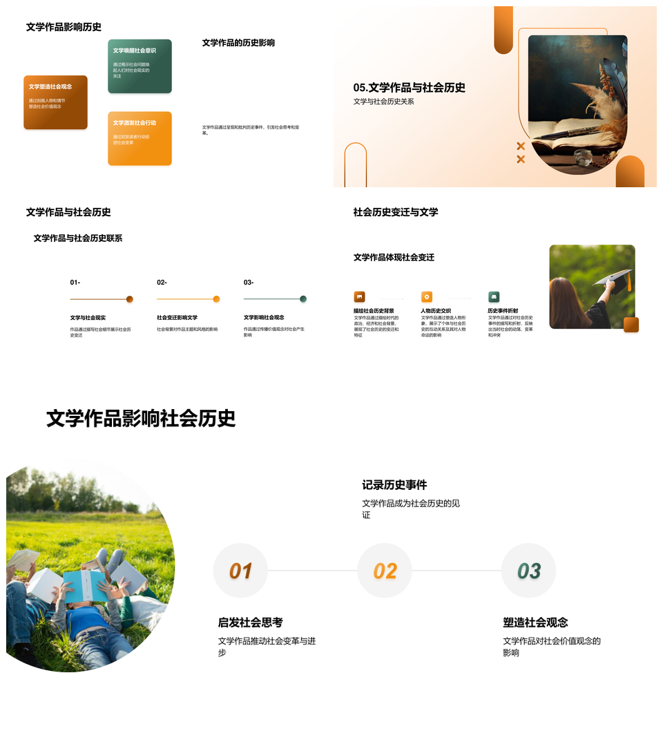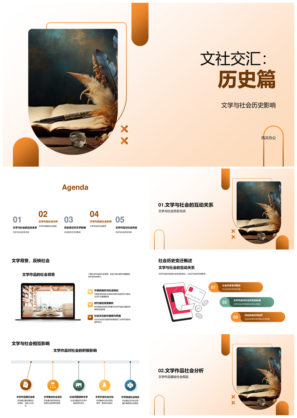 风云办公提供的文学作品社会历史变迁互映PPT模板,下载格式为pptx,一共23页,作品中文字及图均可以修改和编辑,图片更改请在作品中右键图片并更换,文字修改请直接点击文字进行修改。