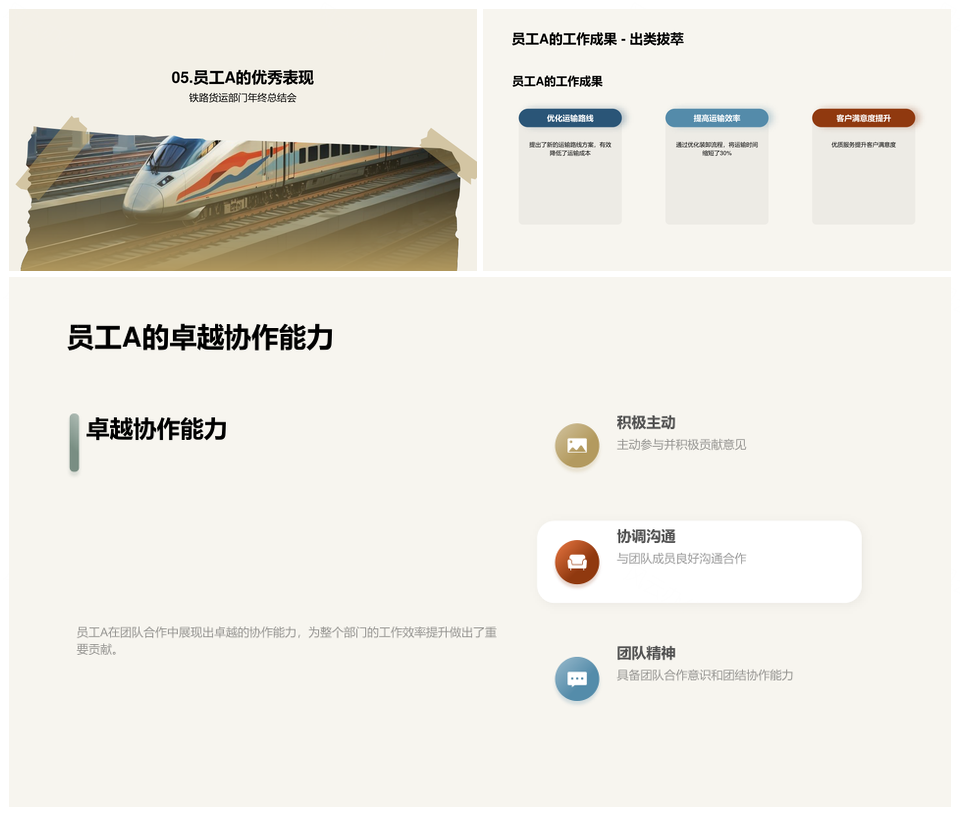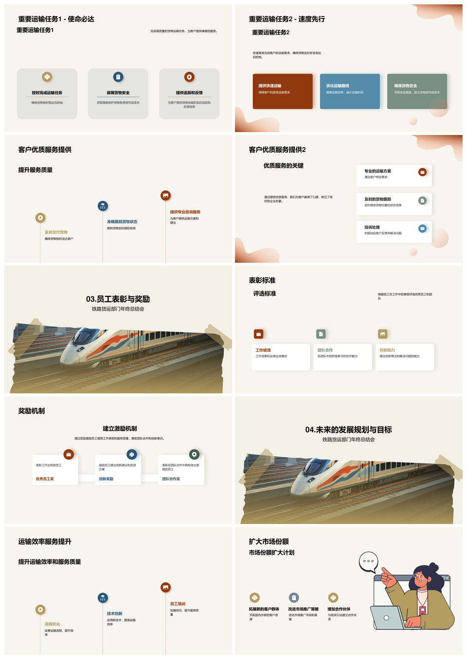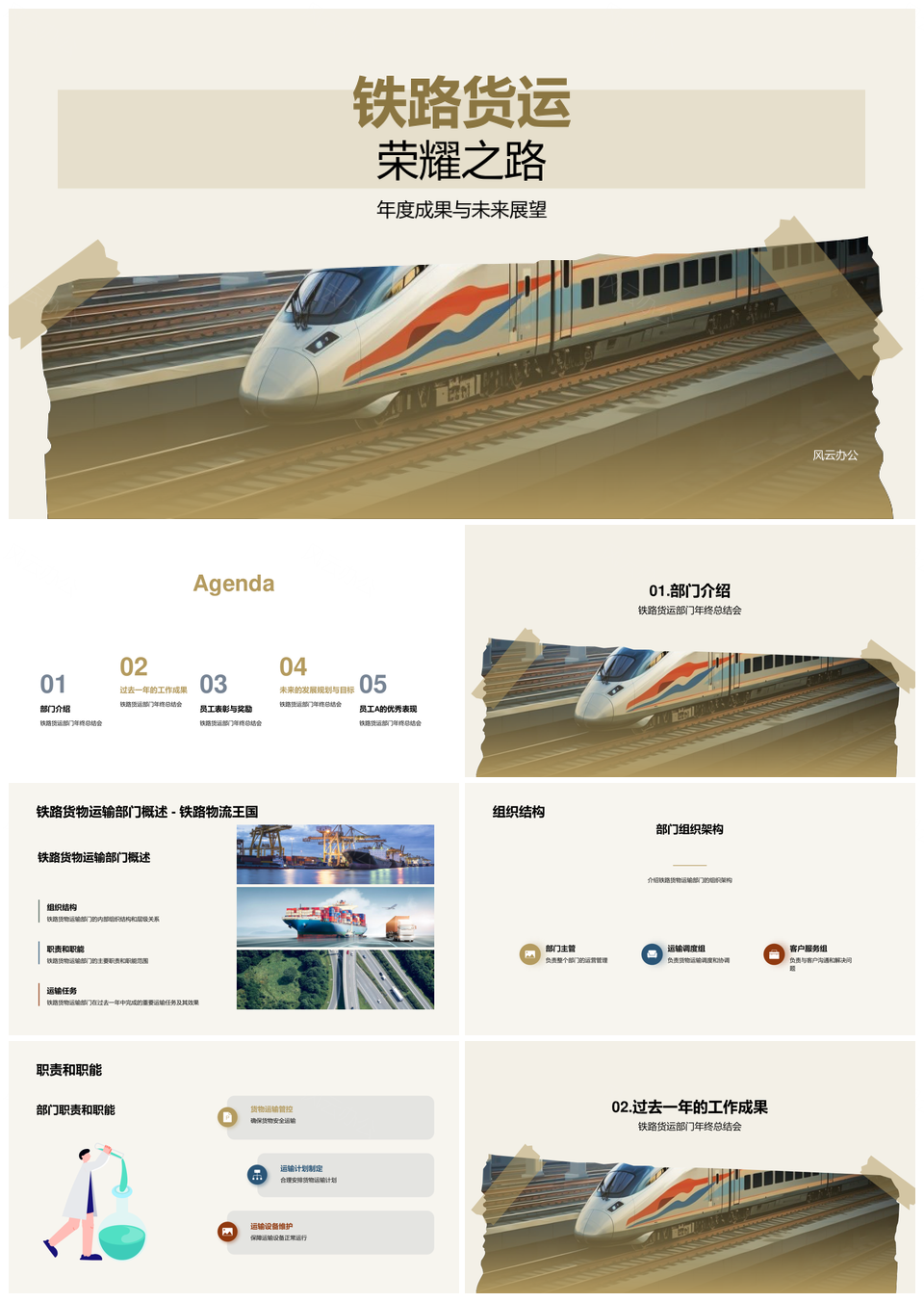 这是一张铁路货运部门经理年终职责运输任务总结PPT模板,包含铁路、货运、部门、经理、年终、职责、运输、任务、总结等主题内容,也可用作铁路货运部门经理、部门经理年终职责、货运部门经理年终、年终职责运输任务、职责运输任务总结、铁路货运运输任务、铁路货运部门、货运部门经理、部门经理年终、经理年终职责、年终职责运输、职责运输任务、运输任务总结、铁路货运、任务总结等PPT场景使用。 风云办公提供的铁路货运部门经理年终职责运输任务总结PPT模板,下载格式为pptx,一共21页,作品中文字及图均可以修改和编辑,图片更改请在作品中右键图片并更换,文字修改请直接点击文字进行修改。