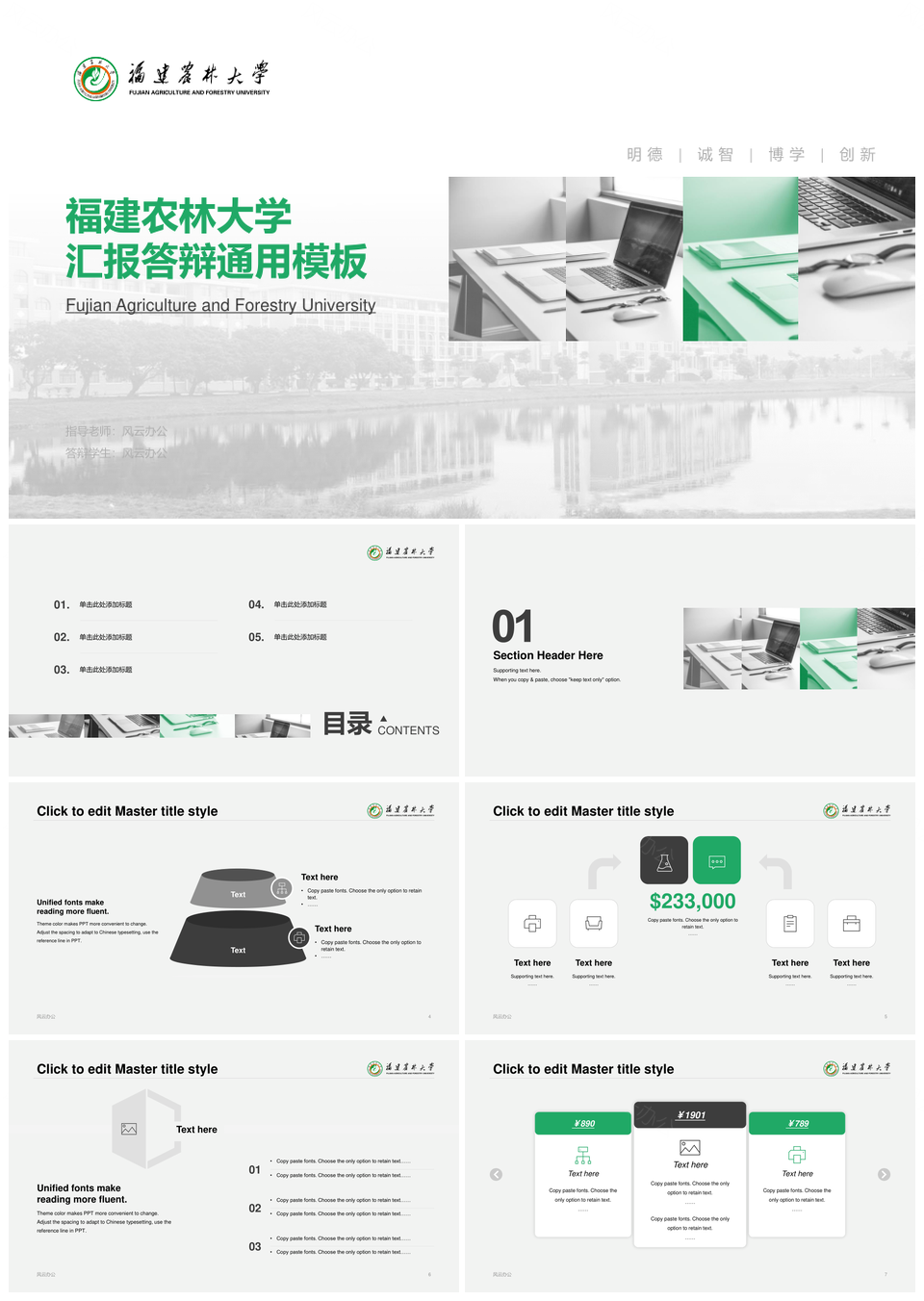 风云办公提供的福建农大绿色毕业答辩高校定制PPT模板,下载格式为pptx,一共24页,作品中文字及图均可以修改和编辑,图片更改请在作品中右键图片并更换,文字修改请直接点击文字进行修改。