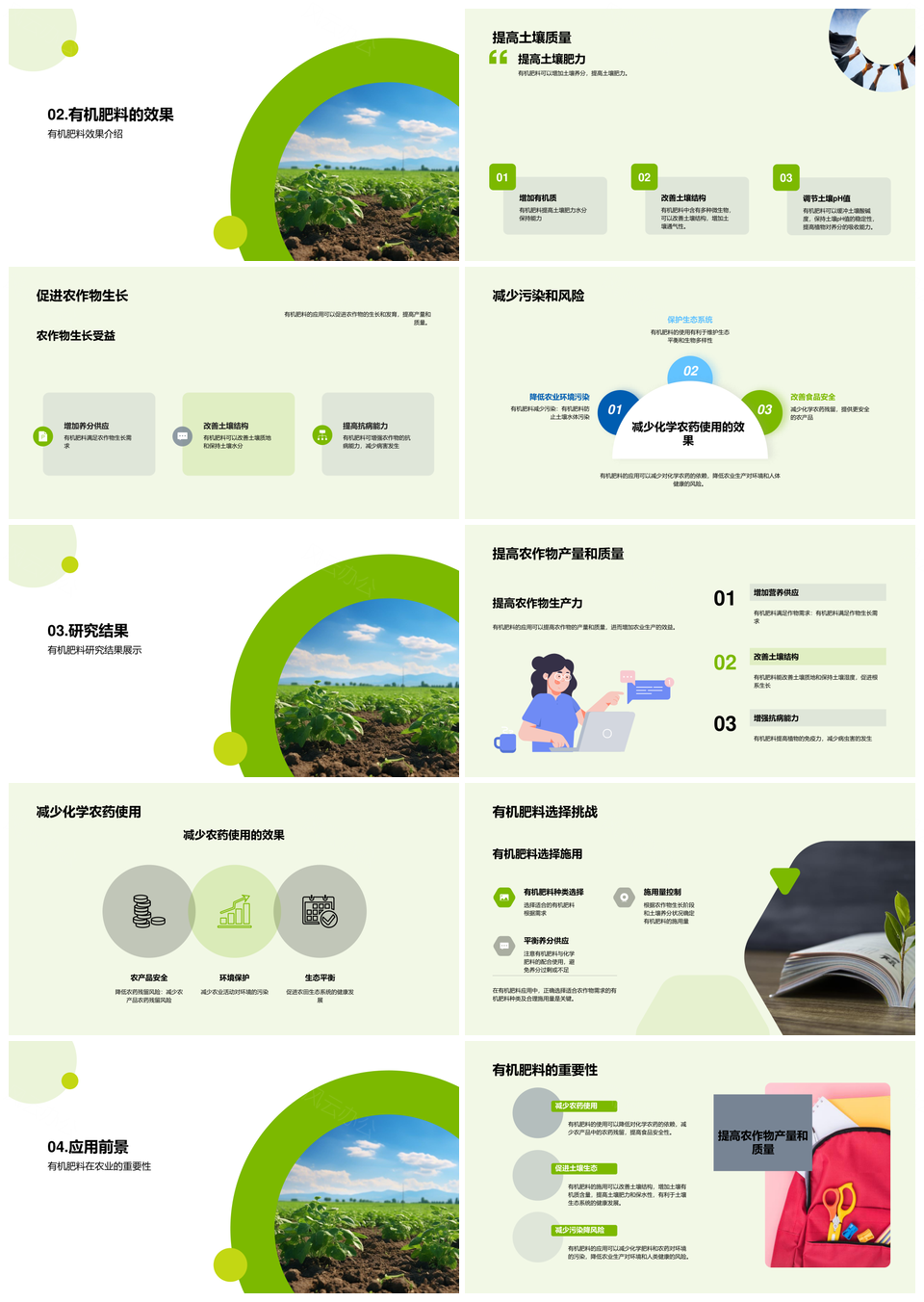 这是一张农学专科有机肥料对土壤质量影响研究答辩PPT模板,包含农学专科、有机肥料、土壤质量、影响研究、答辩等主题内容,也可用作农学专科有机肥料、农学专科有机肥料土壤、农学专科有机土壤质量、农学专科有机研究答辩、农学专科土壤质量影响、专科有机肥料土壤质量、专科有机土壤质量影响、专科有机影响研究答辩、有机肥料土壤质量影响、有机肥料质量影响研究、有机土壤质量影响研究、有机质量影响研究答辩、肥料土壤质量影响研究、土壤质量影响研究答辩、质量影响研究答辩等PPT场景使用。 风云办公提供的农学专科有机肥料对土壤质量影响研究答辩PPT模板,下载格式为pptx,一共24页,作品中文字及图均可以修改和编辑,图片更改请在作品中右键图片并更换,文字修改请直接点击文字进行修改。
