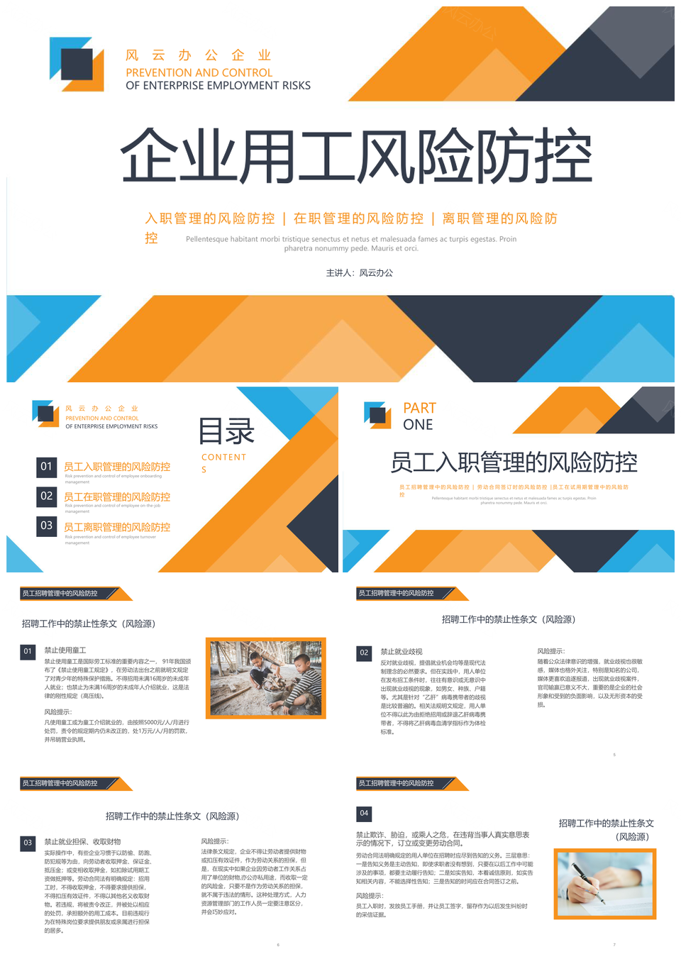 风云办公提供的企业用工全流程风控管理PPT模板,下载格式为pptx,一共40页,作品中文字及图均可以修改和编辑,图片更改请在作品中右键图片并更换,文字修改请直接点击文字进行修改。