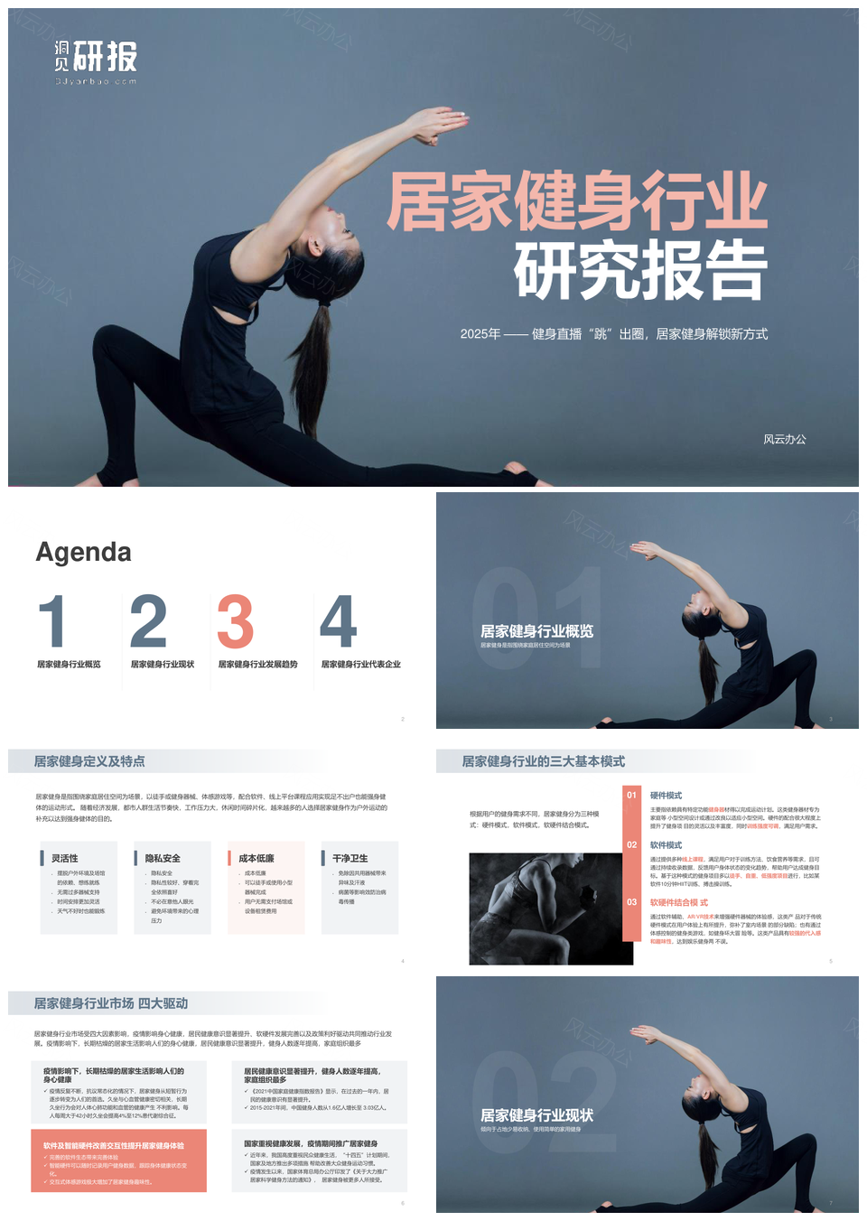 风云办公提供的2022居家健身直播趋势研究PPT模板,下载格式为pptx,一共20页,作品中文字及图均可以修改和编辑,图片更改请在作品中右键图片并更换,文字修改请直接点击文字进行修改。