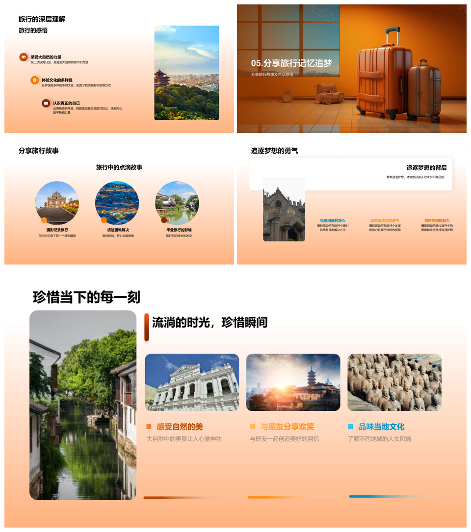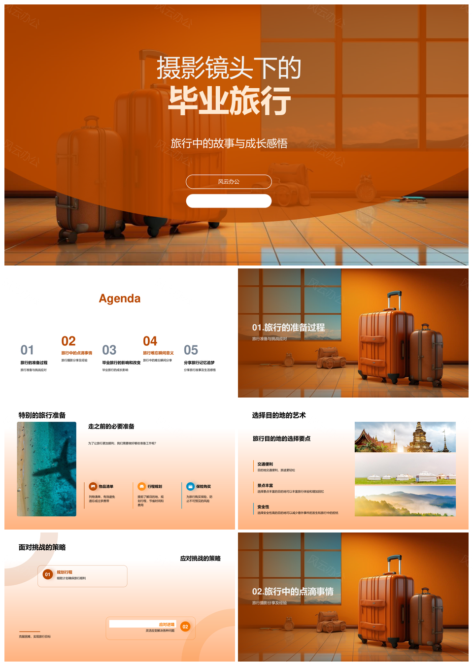 风云办公提供的毕业旅行行摄挑战与成长蜕变PPT模板,下载格式为pptx,一共23页,作品中文字及图均可以修改和编辑,图片更改请在作品中右键图片并更换,文字修改请直接点击文字进行修改。