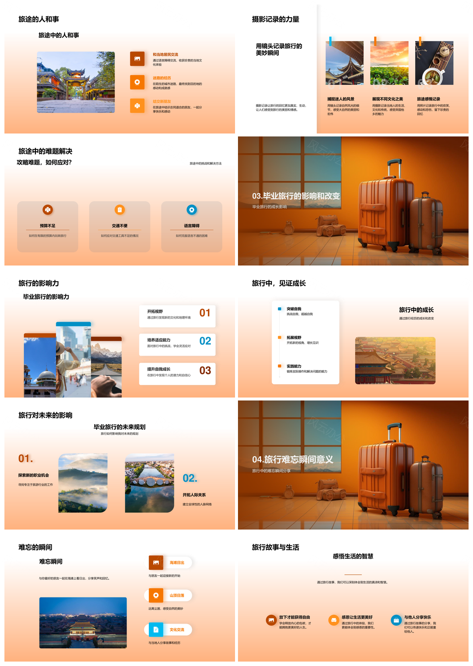 这是一张毕业旅行行摄挑战与成长蜕变PPT模板,包含毕业旅行、行摄挑战、成长蜕变等主题内容,也可用作毕业旅行行摄挑战、毕业旅行行摄成长、毕业旅行行摄蜕变、旅行行摄挑战成长、旅行行摄挑战蜕变、行摄挑战成长蜕变、毕业行摄挑战成长、毕业行摄挑战蜕变、毕业挑战成长蜕变、旅行挑战成长蜕变、毕业旅行行摄、旅行行摄挑战、行摄挑战成长、毕业行摄蜕变、成长蜕变等PPT场景使用。