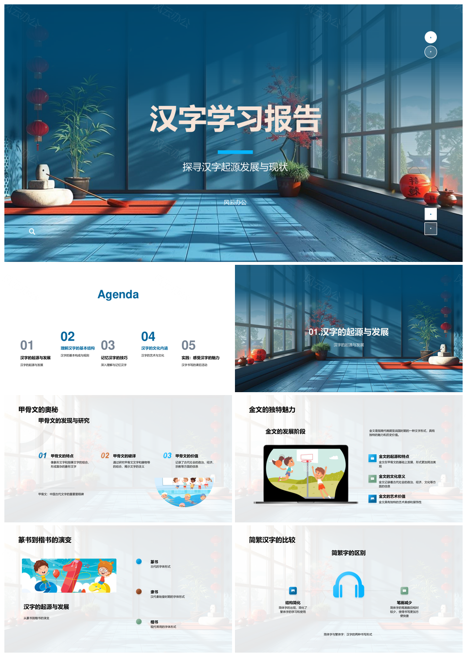 汉字演变历程甲骨文金文篆书楷书简繁对比学习报告PPT模板推荐