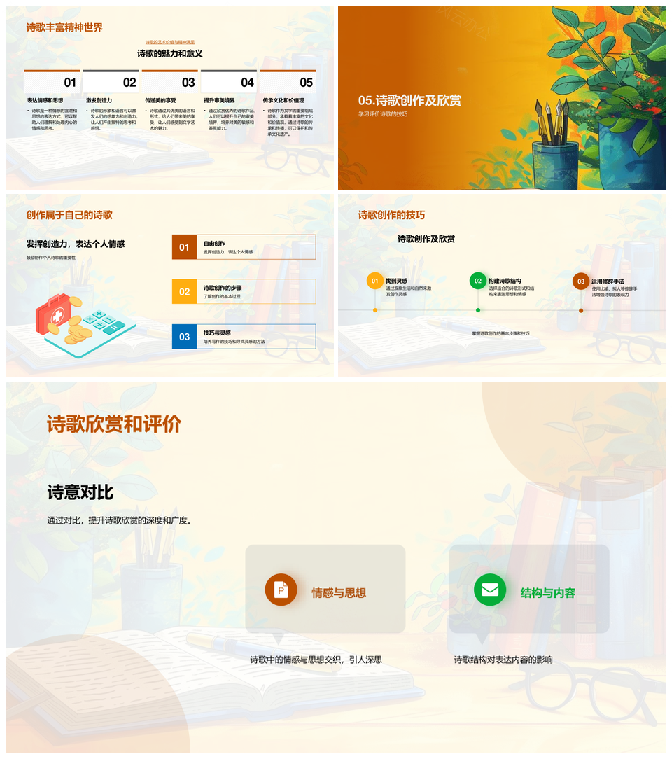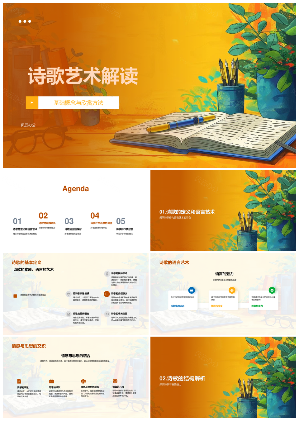 这是一张诗歌艺术结构主题解析创作赏析节奏定义PPT模板,包含诗歌、艺术、结构、主题、解析、创作、赏析、节奏、定义等主题内容,也可用作诗歌艺术结构主题解析创作、诗歌艺术结构主题、诗歌艺术结构解析、诗歌主题解析创作赏析、艺术结构主题解析创作、诗歌解析创作赏析节奏、主题解析创作赏析节奏、诗歌创作赏析节奏定义、艺术主题解析创作赏析、结构主题解析创作赏析、诗歌节奏定义艺术结构、诗歌创作艺术结构主题、结构解析创作赏析节奏、诗歌主题创作赏析节奏、诗歌艺术结构解析创作等PPT场景使用。 风云办公提供的诗歌艺术结构主题解析创作赏析节奏定义PPT模板,下载格式为pptx,一共23页,作品中文字及图均可以修改和编辑,图片更改请在作品中右键图片并更换,文字修改请直接点击文字进行修改。