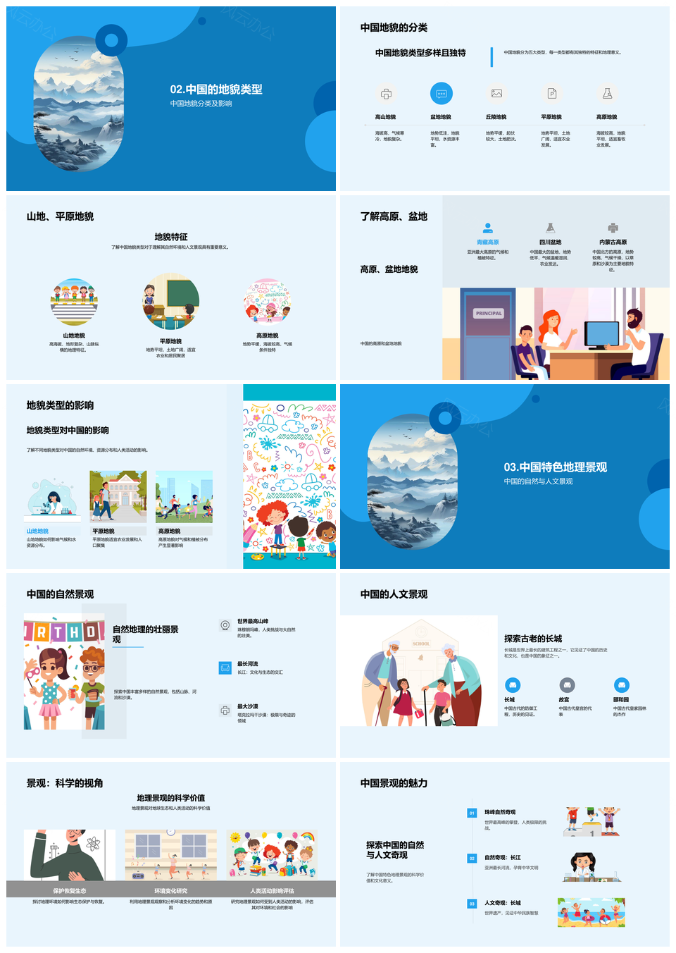 风云办公提供的中国地理气候地貌与山地平原高原盆地PPT模板,下载格式为pptx,一共28页,作品中文字及图均可以修改和编辑,图片更改请在作品中右键图片并更换,文字修改请直接点击文字进行修改。
