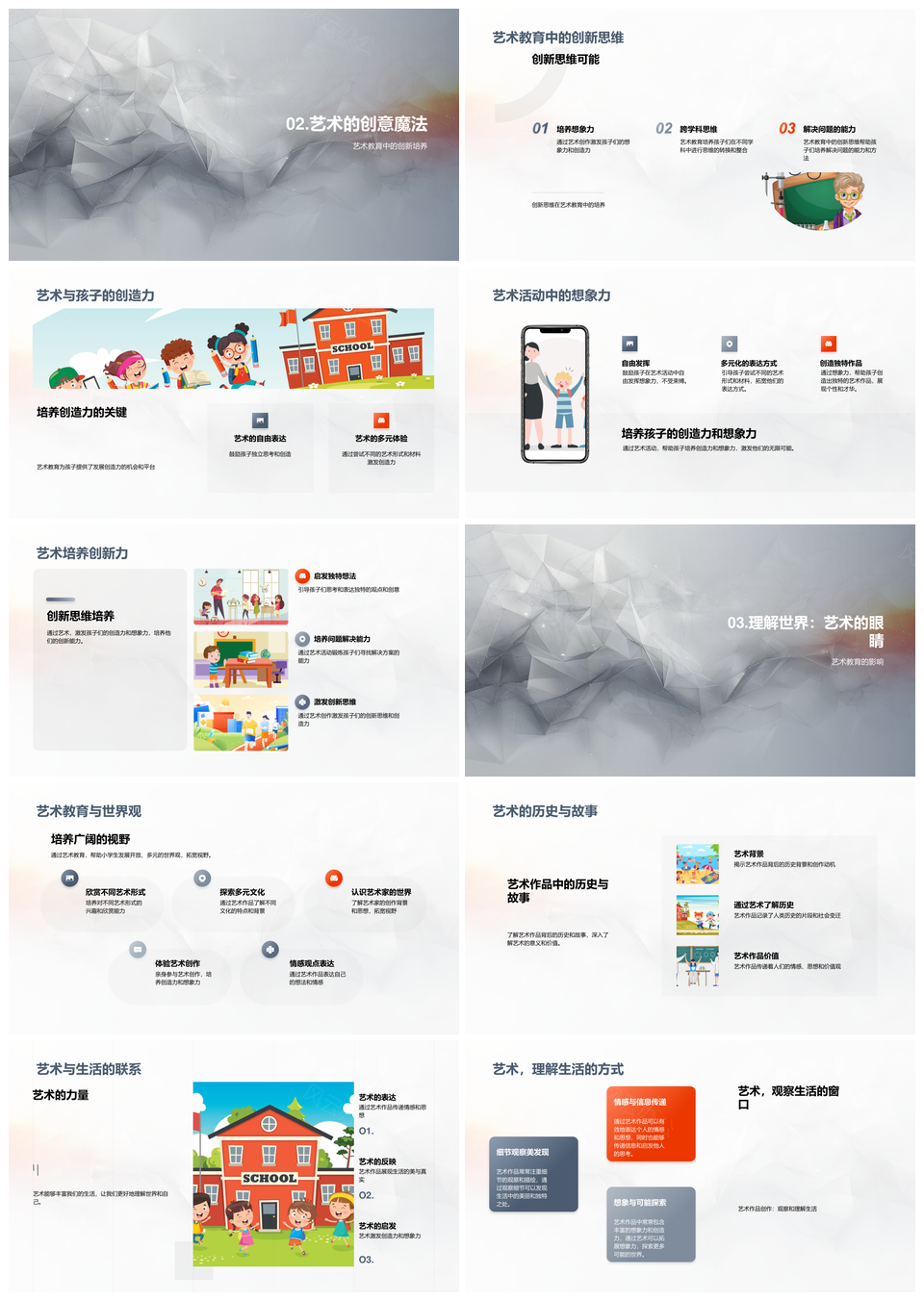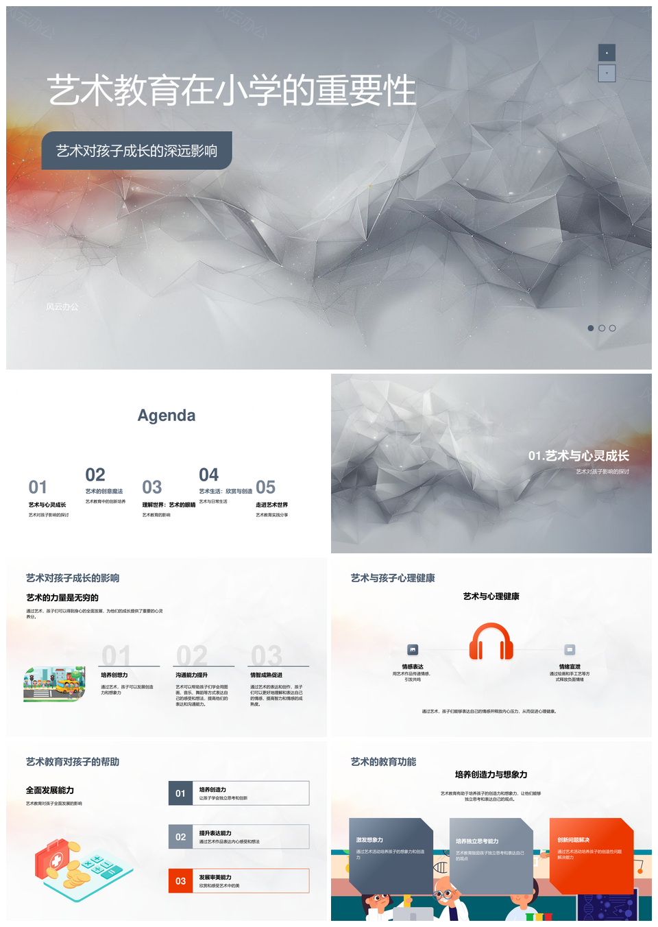 风云办公提供的小学艺术教育助力孩子多元成长PPT模板,下载格式为pptx,一共28页,作品中文字及图均可以修改和编辑,图片更改请在作品中右键图片并更换,文字修改请直接点击文字进行修改。