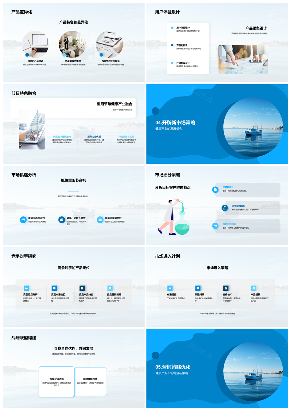风云办公提供的健康产业蓝海战略重阳节市场开拓PPT模板,下载格式为pptx,一共33页,作品中文字及图均可以修改和编辑,图片更改请在作品中右键图片并更换,文字修改请直接点击文字进行修改。