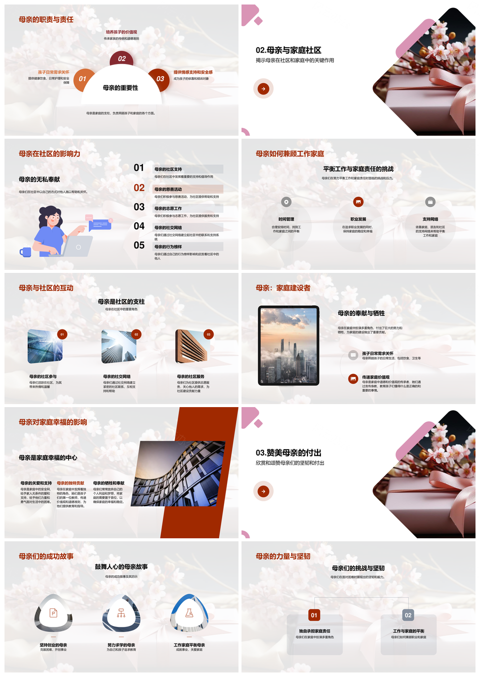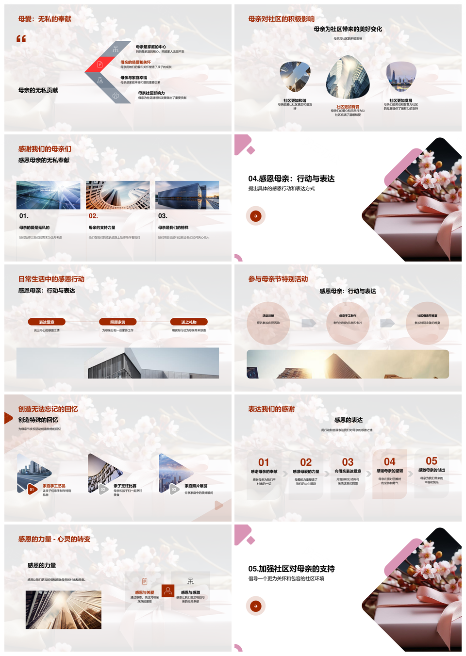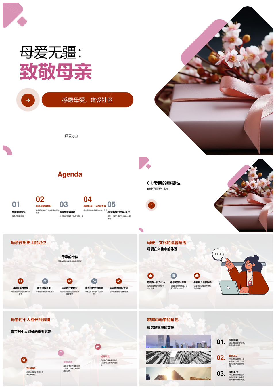 风云办公提供的母爱无疆母亲节家庭社区共成长PPT模板,下载格式为pptx,一共33页,作品中文字及图均可以修改和编辑,图片更改请在作品中右键图片并更换,文字修改请直接点击文字进行修改。