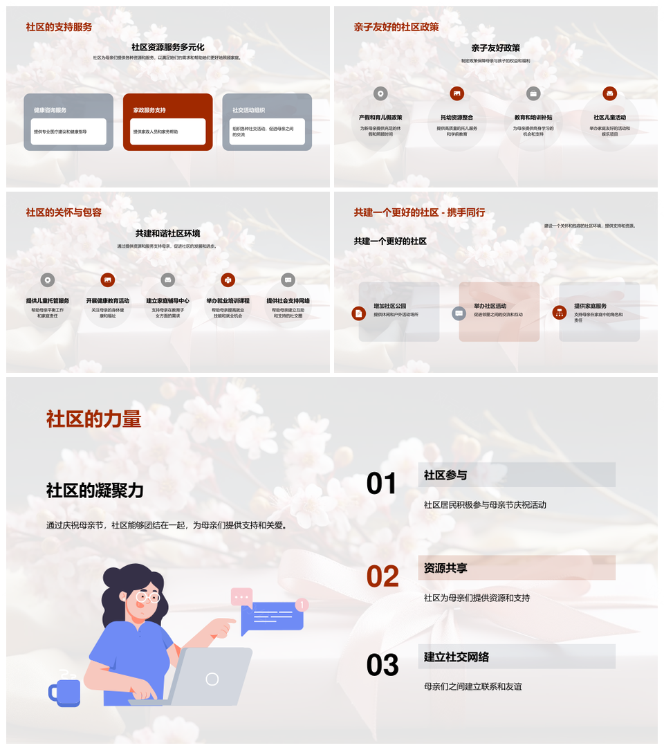 这是一张母爱无疆母亲节家庭社区共成长PPT模板,包含母爱、无疆、母亲节、家庭、社区、共成长等主题内容,也可用作母亲节家庭社区共成长、母爱无疆母亲节家庭、母爱无疆母亲节、母亲节家庭社区、家庭社区共成长、母爱无疆家庭社区、母亲节家庭共成长、母亲节社区共成长、母爱无疆家庭、母爱家庭社区、母爱母亲节家庭、家庭社区共、无疆母亲节家庭、母爱母亲节、家庭共成长等PPT场景使用。