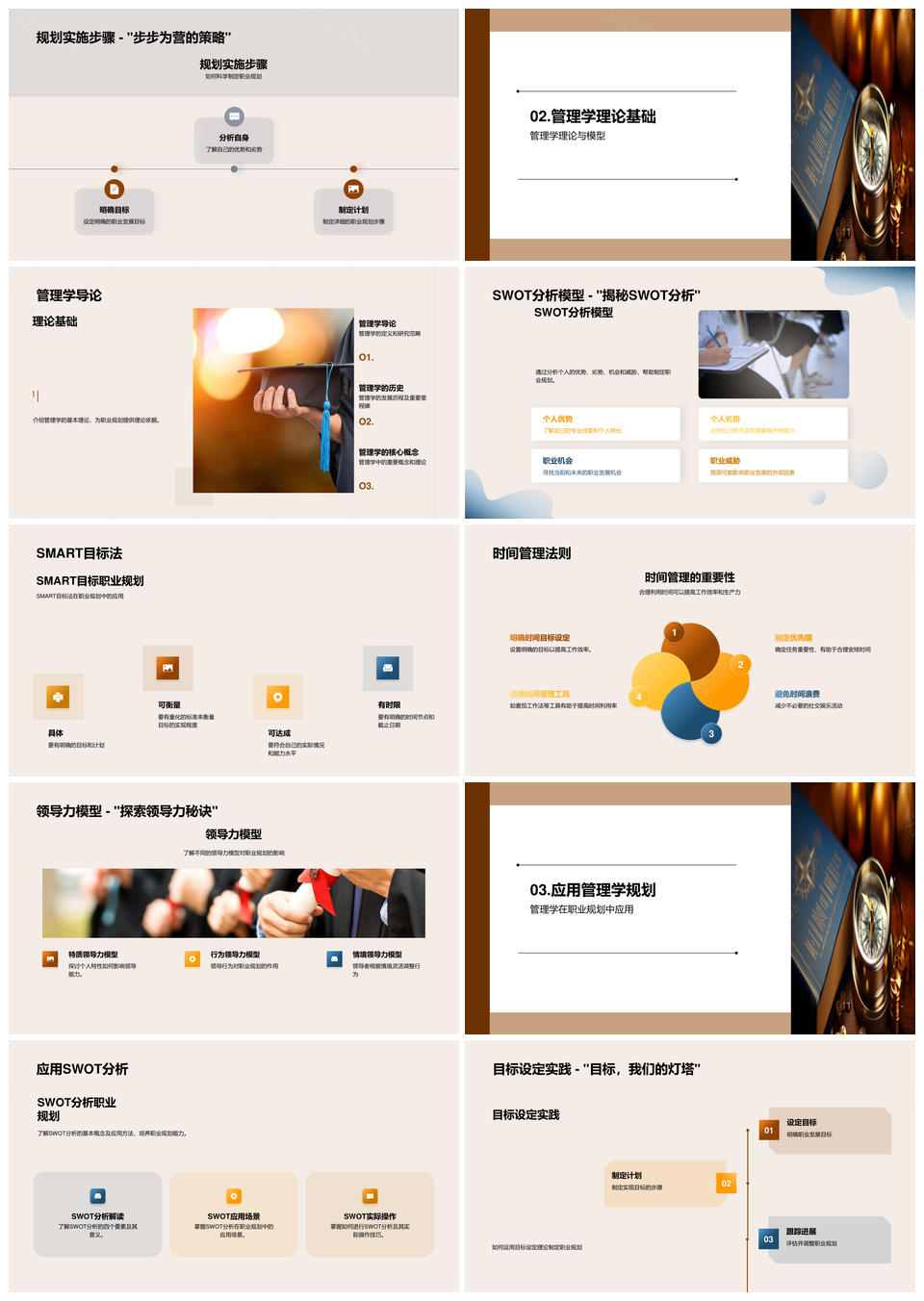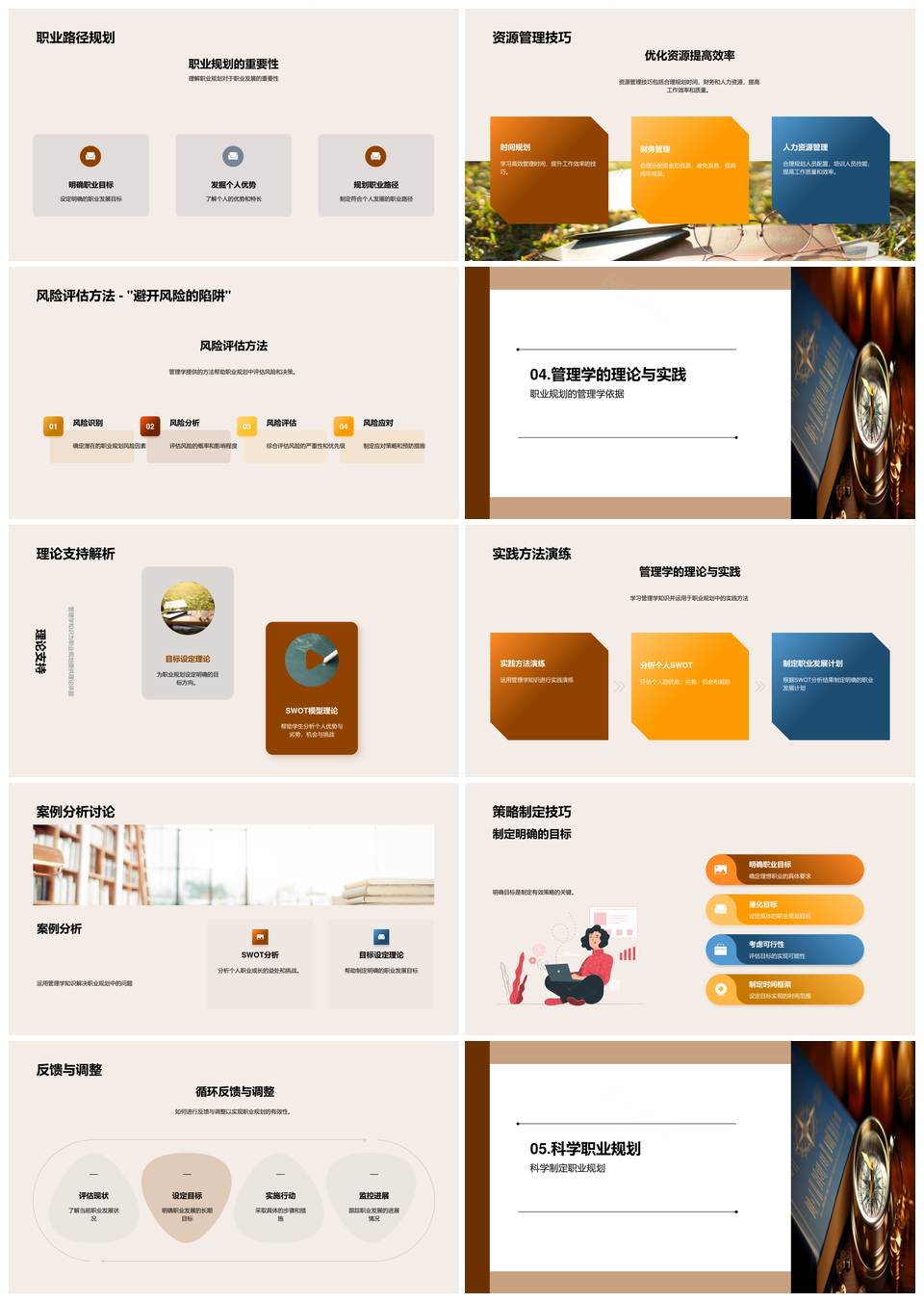 风云办公提供的管理学SWOT职业规划目标设定实践PPT模板,下载格式为pptx,一共33页,作品中文字及图均可以修改和编辑,图片更改请在作品中右键图片并更换,文字修改请直接点击文字进行修改。