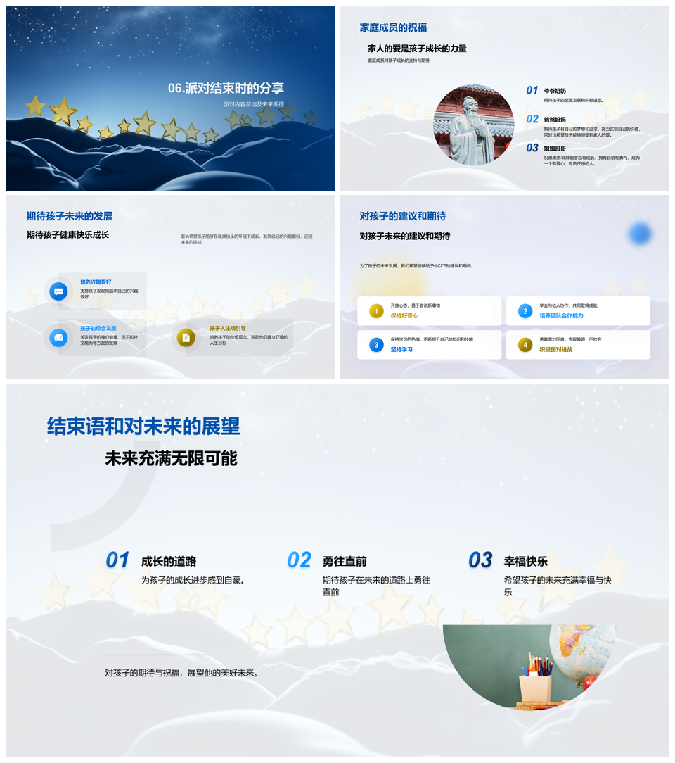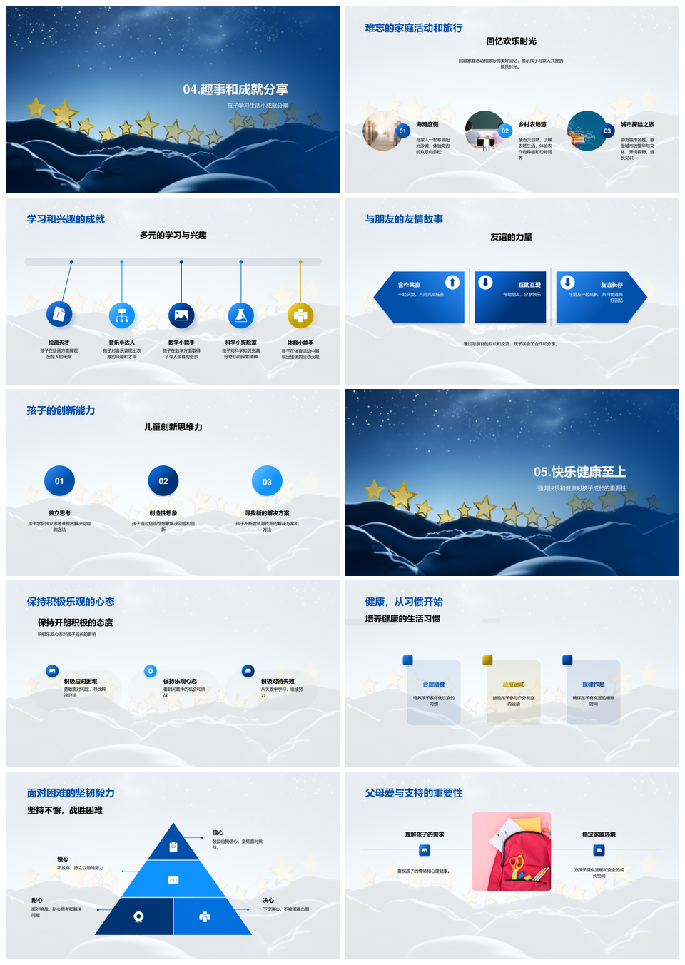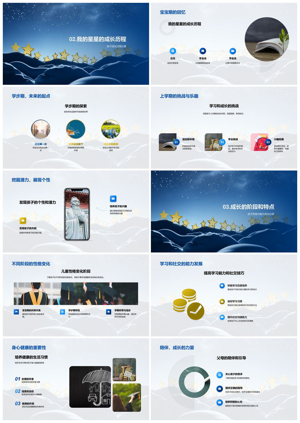 风云办公提供的星光成长路父母伴学步友情璀璨PPT模板,下载格式为pptx,一共33页,作品中文字及图均可以修改和编辑,图片更改请在作品中右键图片并更换,文字修改请直接点击文字进行修改。
