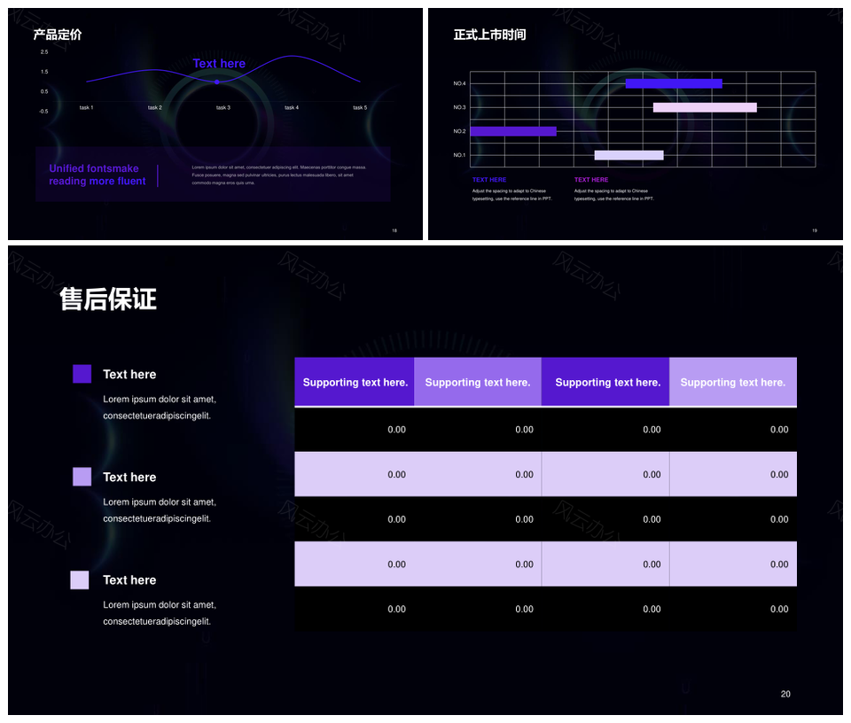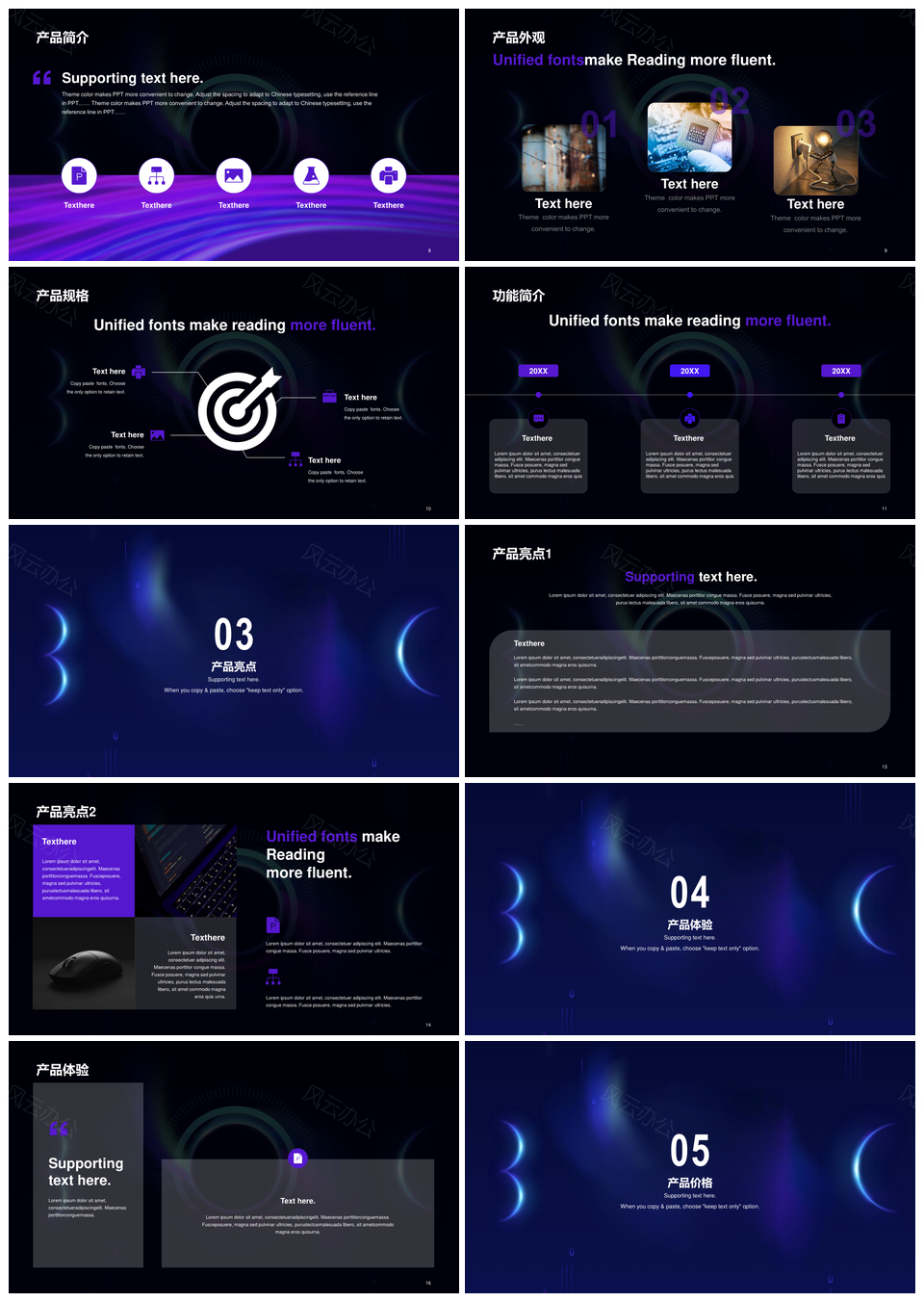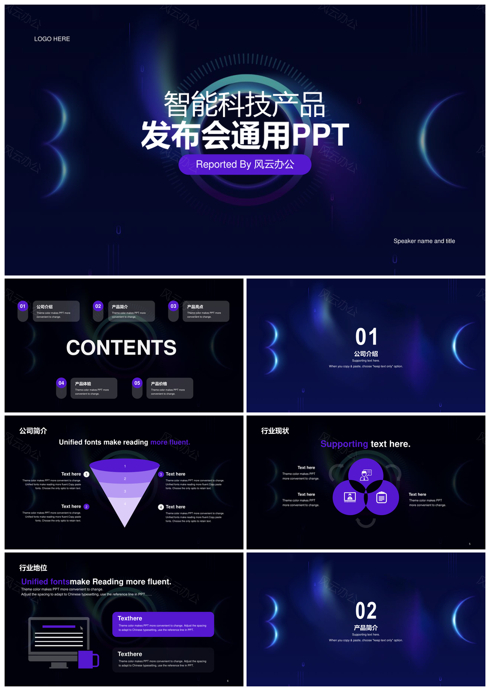 风云办公提供的紫耀暗黑炫酷科技发布会PPT模板,下载格式为pptx,一共21页,作品中文字及图均可以修改和编辑,图片更改请在作品中右键图片并更换,文字修改请直接点击文字进行修改。