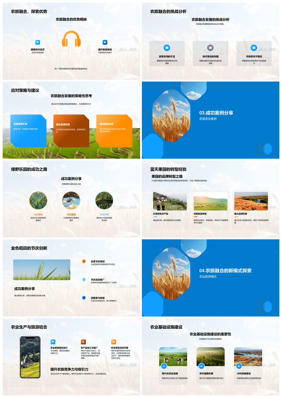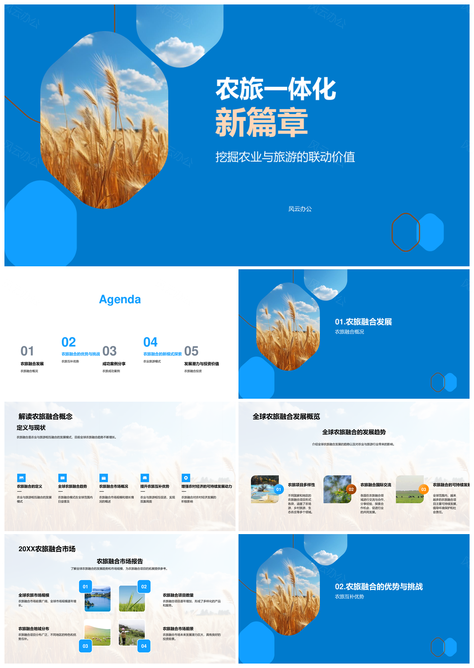 风云办公提供的农旅融合绿野乐园蓝天果园金色稻田PPT模板,下载格式为pptx,一共23页,作品中文字及图均可以修改和编辑,图片更改请在作品中右键图片并更换,文字修改请直接点击文字进行修改。