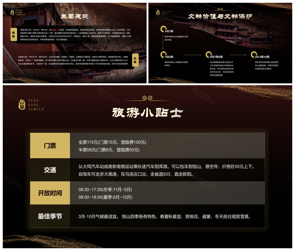 风云办公提供的黑神话悬空寺旅游食摄攻略PPT模板,下载格式为pptx,一共11页,作品中文字及图均可以修改和编辑,图片更改请在作品中右键图片并更换,文字修改请直接点击文字进行修改。