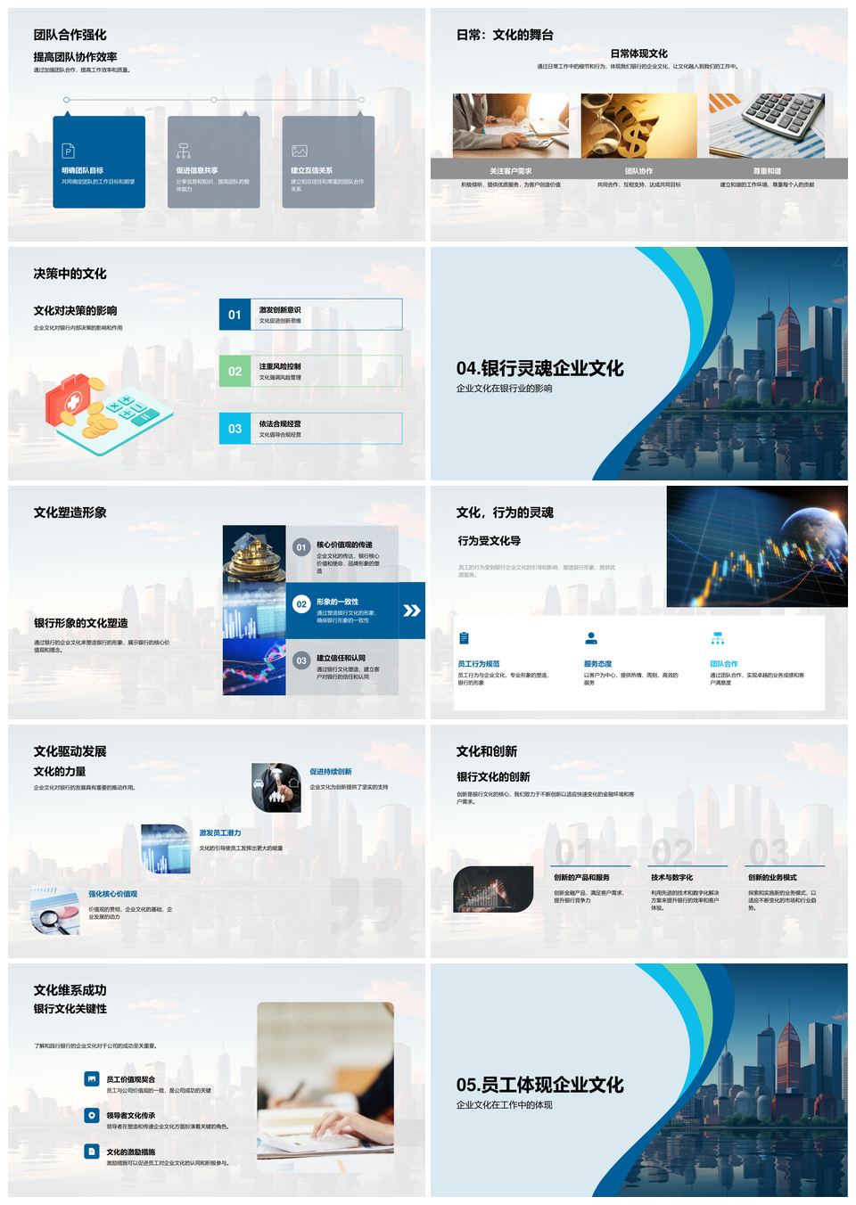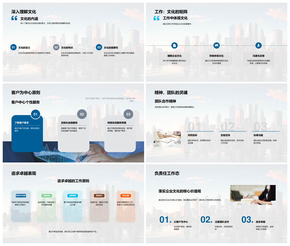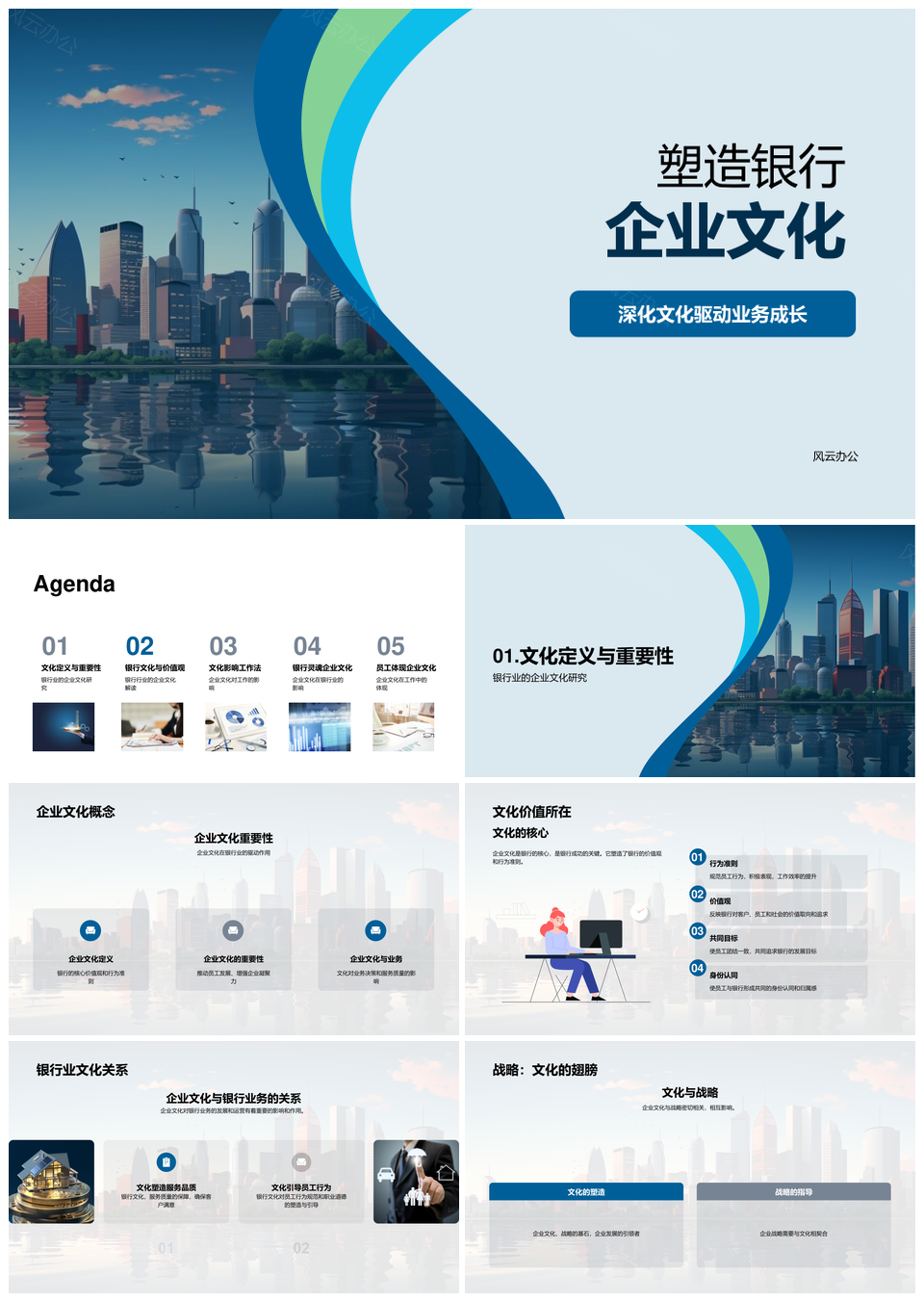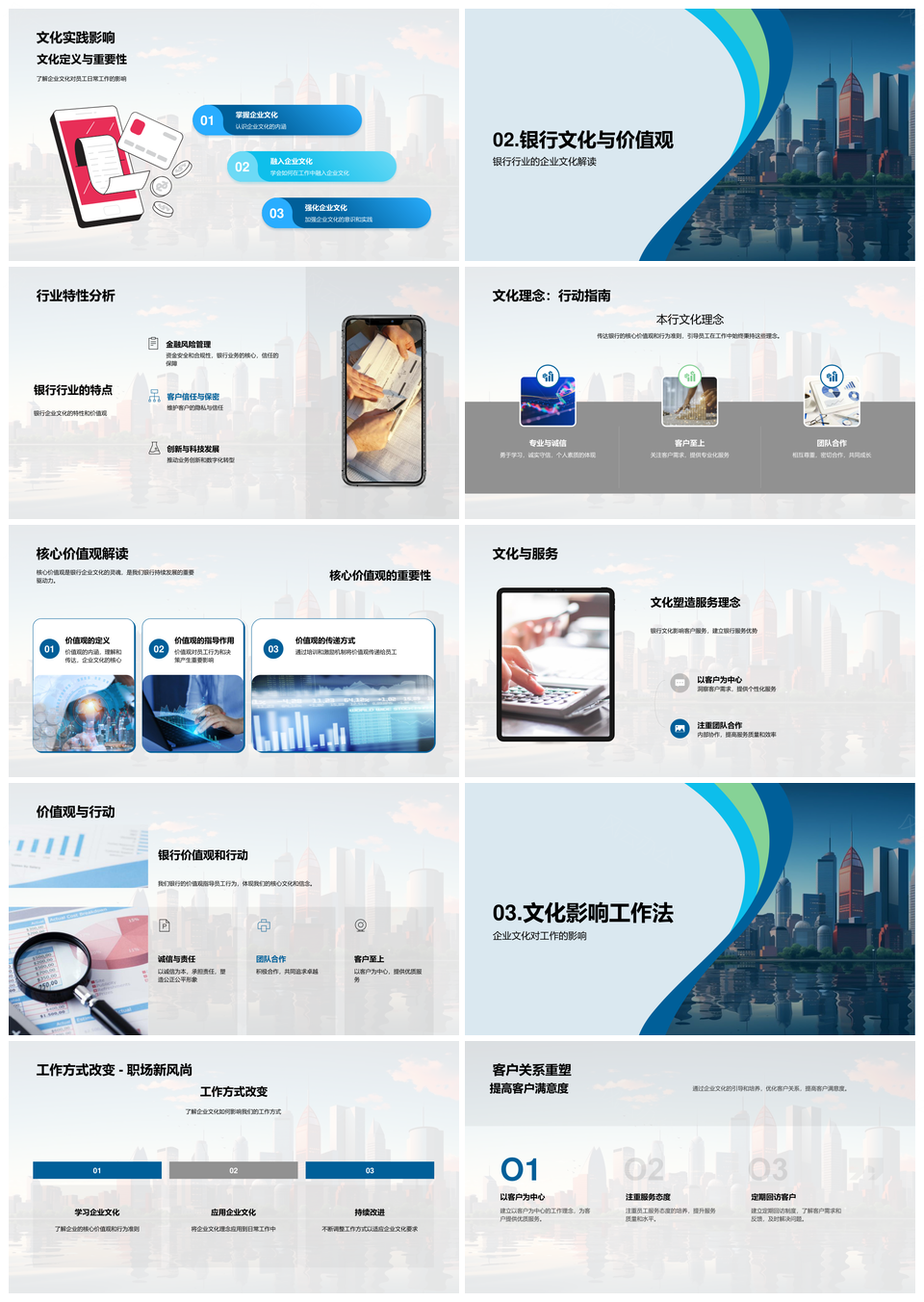 风云办公提供的银行业务文化价值观与团队协作服务PPT模板,下载格式为pptx,一共34页,作品中文字及图均可以修改和编辑,图片更改请在作品中右键图片并更换,文字修改请直接点击文字进行修改。