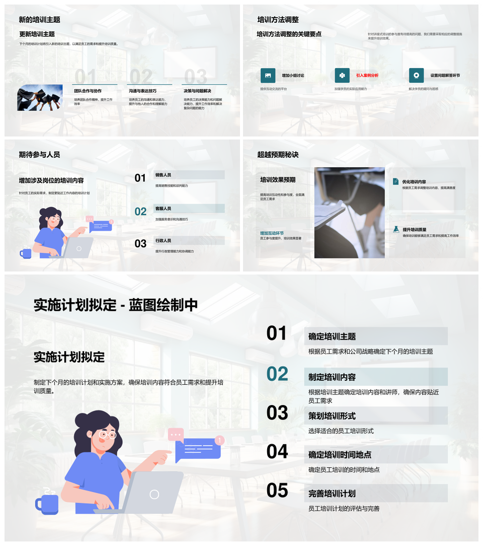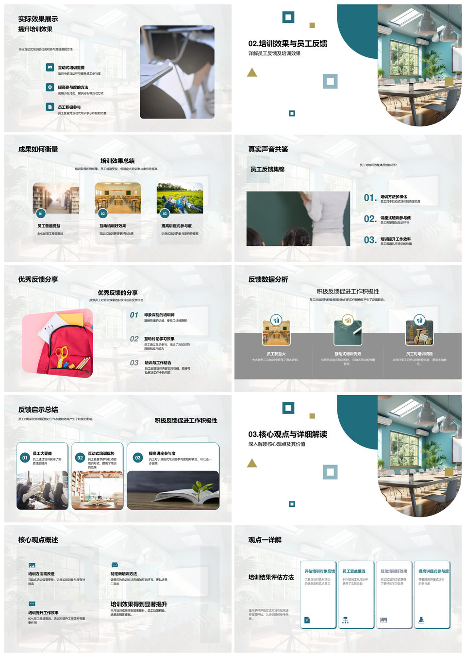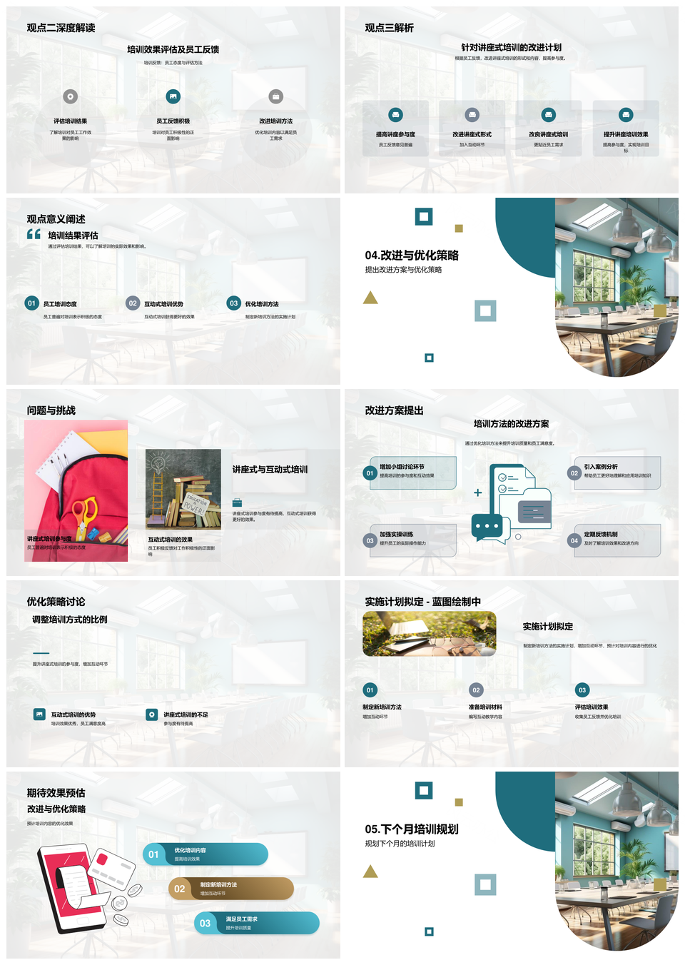 这是一张培训效果优化策略互动方法反馈实施挑战研讨会布局PPT模板,包含培训效果、优化策略、互动方法、反馈实施、挑战研讨会、布局等主题内容,也可用作培训效果优化策略互动方法、优化策略互动方法反馈实施、互动方法反馈实施挑战、反馈实施挑战研讨会布局、实施挑战研讨会布局、培训效果优化策略互动、优化策略互动方法反馈、互动方法反馈实施、反馈实施挑战、实施挑战研讨会、挑战研讨会布局、培训效果优化、优化策略互动、互动方法反馈、实施挑战等PPT场景使用。 风云办公提供的培训效果优化策略互动方法反馈实施挑战研讨会布局PPT模板,下载格式为pptx,一共33页,作品中文字及图均可以修改和编辑,图片更改请在作品中右键图片并更换,文字修改请直接点击文字进行修改。
