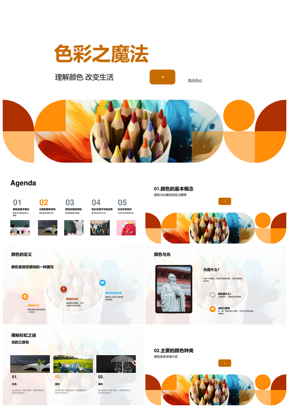 风云办公提供的三原色色轮搭配与色彩冷暖明暗特性PPT模板,下载格式为pptx,一共29页,作品中文字及图均可以修改和编辑,图片更改请在作品中右键图片并更换,文字修改请直接点击文字进行修改。