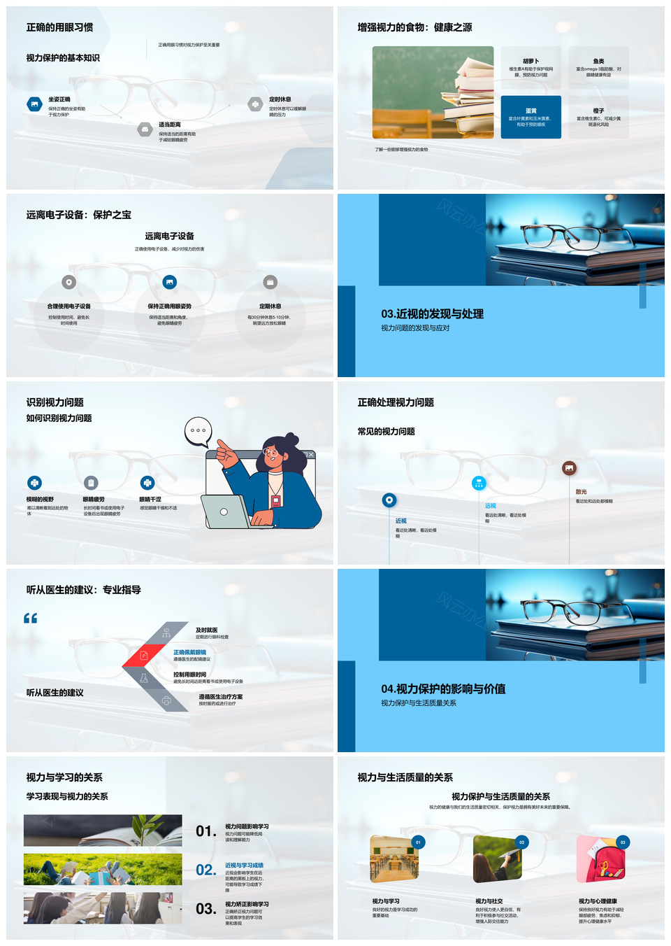 风云办公提供的守护视力预防近视健康教育护眼之道PPT模板,下载格式为pptx,一共23页,作品中文字及图均可以修改和编辑,图片更改请在作品中右键图片并更换,文字修改请直接点击文字进行修改。