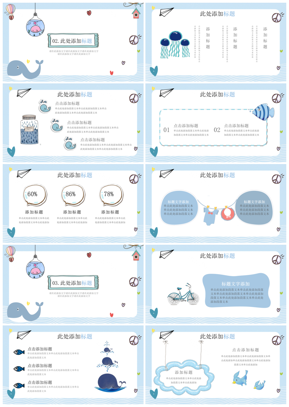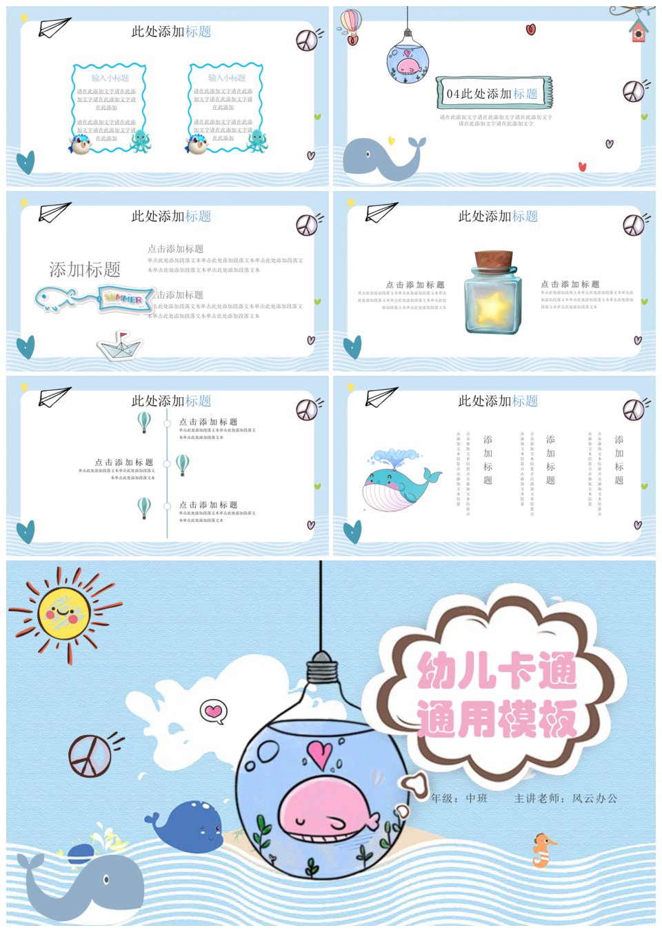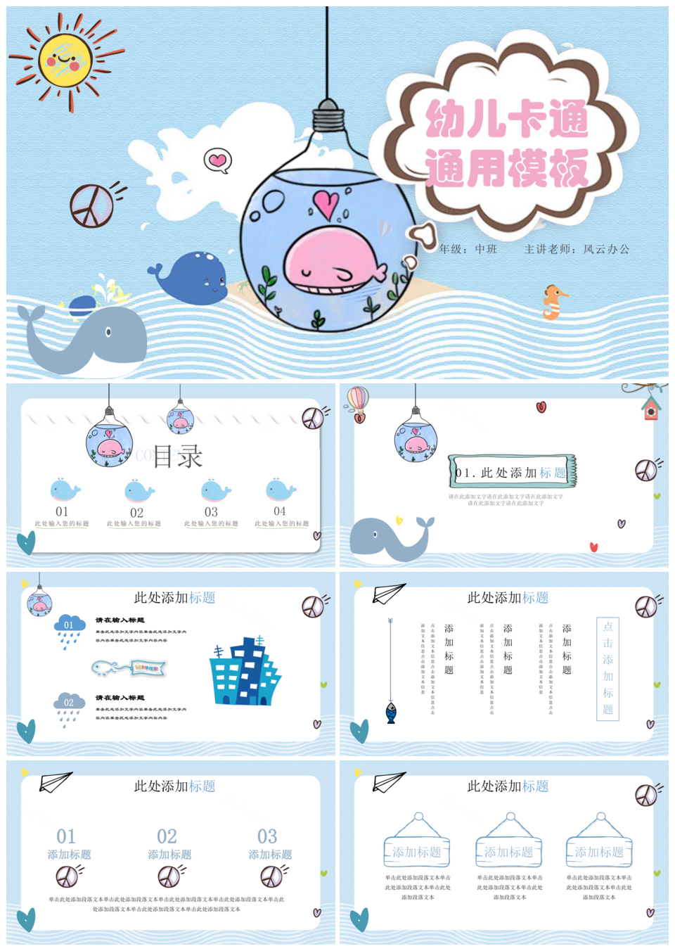 这是一张蓝色幼儿卡通教学课件通用PPT模板,包含蓝色、幼儿、卡通、教学课件等主题内容,也可用作蓝色、幼儿、卡通、教学、课件