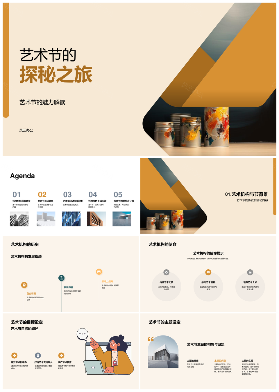 风云办公提供的艺术节策划展览交流工坊艺聚之旅PPT模板,下载格式为pptx,一共33页,作品中文字及图均可以修改和编辑,图片更改请在作品中右键图片并更换,文字修改请直接点击文字进行修改。