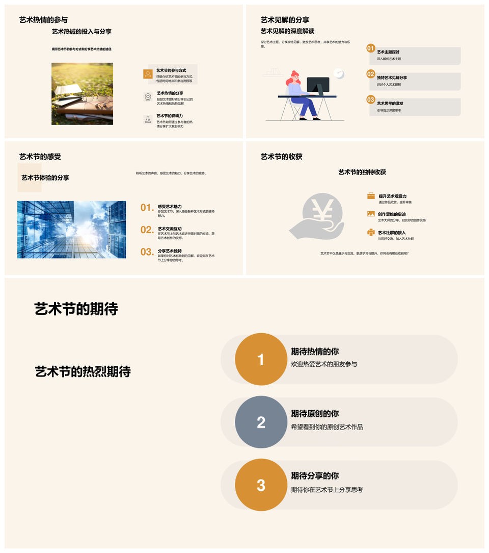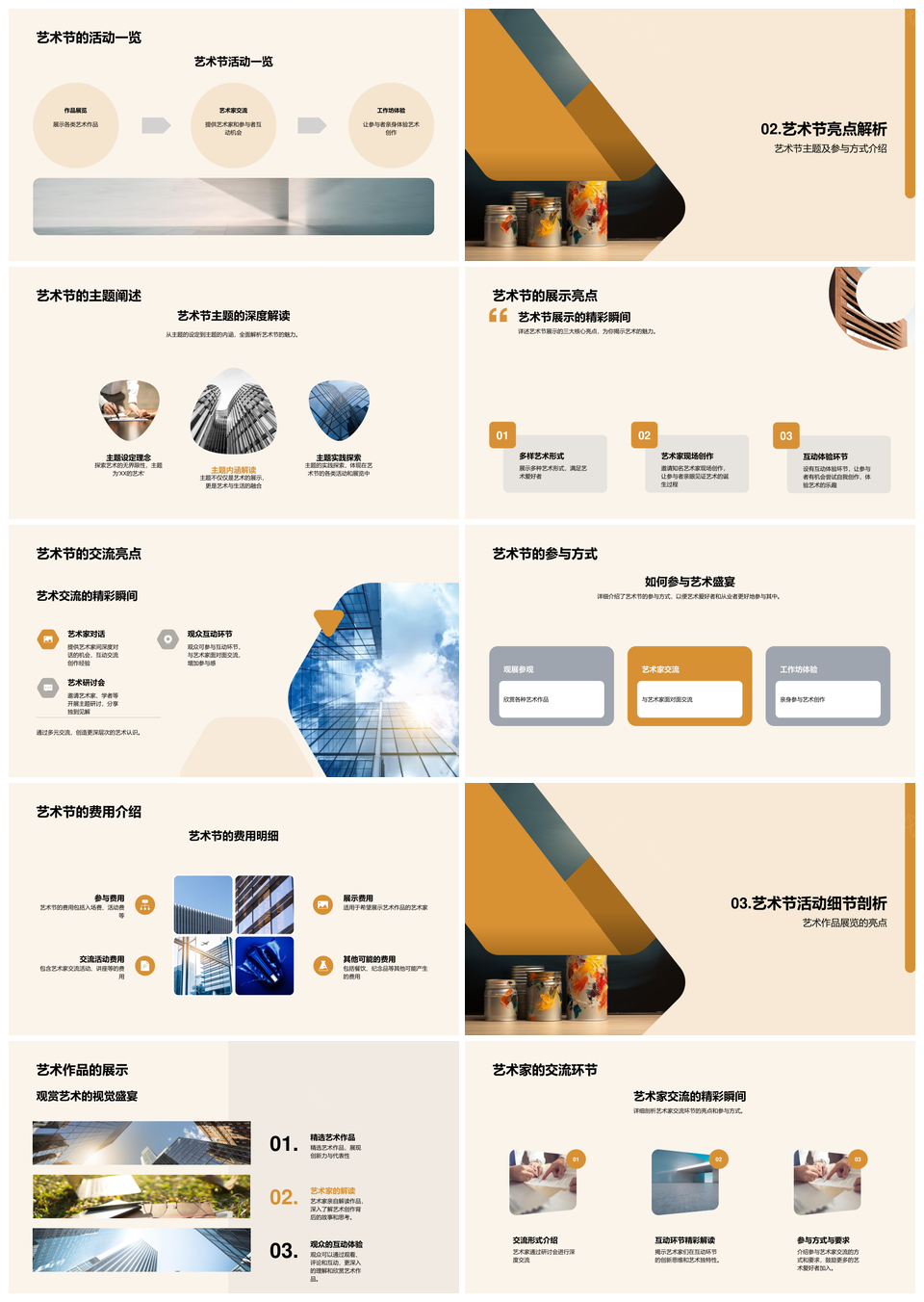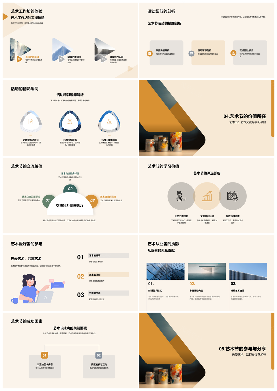 这是一张艺术节策划展览交流工坊艺聚之旅PPT模板,包含艺术节、策划、展览、交流、工坊、艺聚、之旅等主题内容,也可用作艺术节策划展览工坊、策划展览交流工坊、展览交流工坊艺聚、艺术节策划展览、艺术节展览交流工坊、策划展览交流、交流工坊艺聚之旅、展览工坊艺聚之旅、艺术节策划工坊、策划工坊艺聚之旅、艺术节展览交流、展览交流艺聚、工坊艺聚之旅、策划展览工坊、艺术节交流工坊等PPT场景使用。