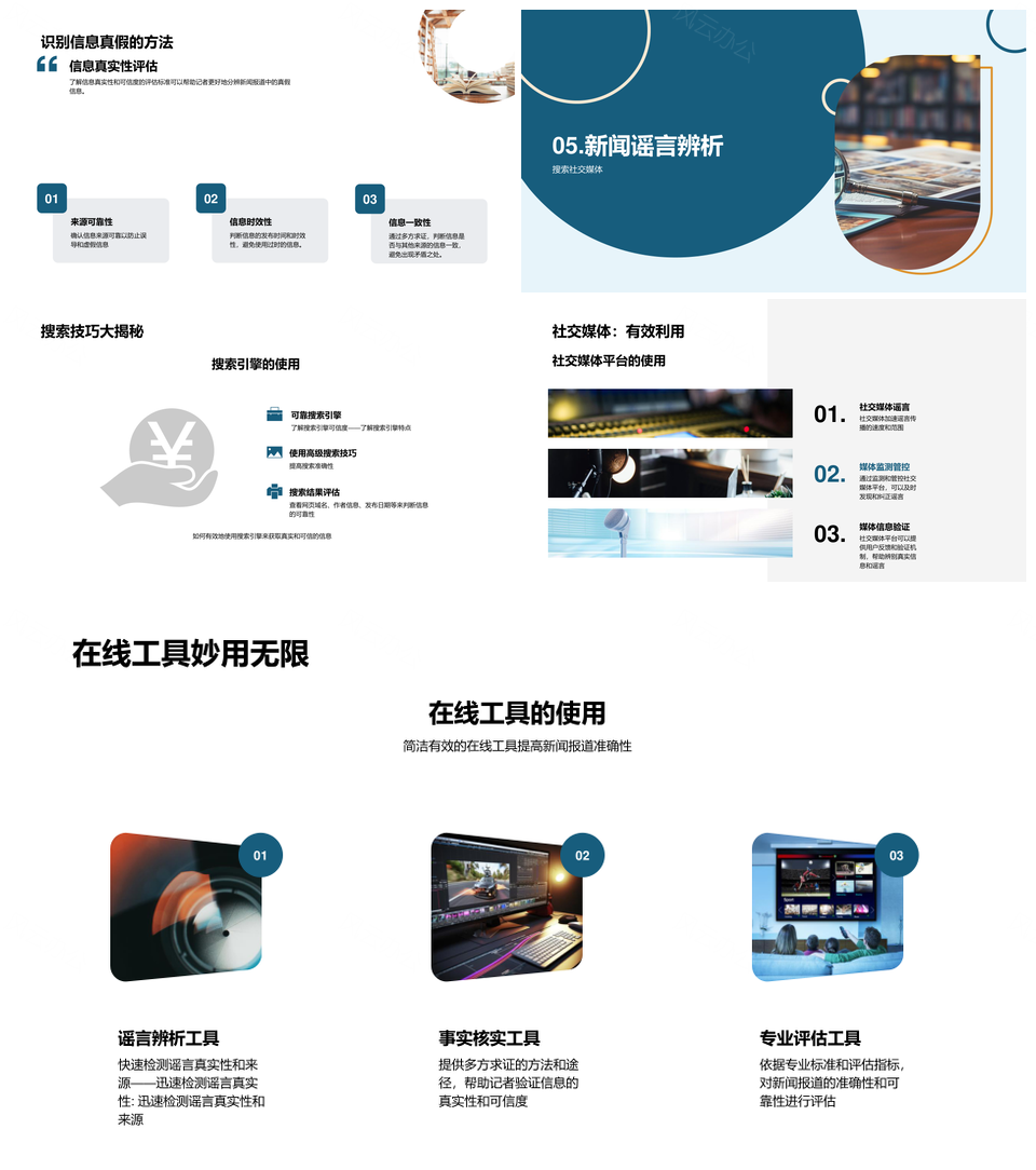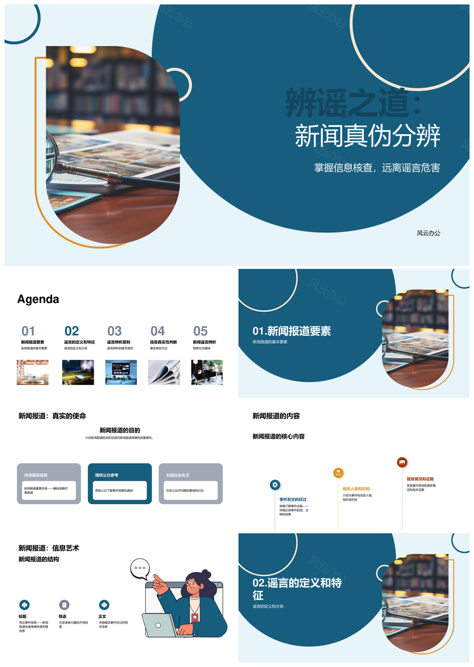 风云办公提供的新闻报道真伪辨析与媒体可靠性PPT模板,下载格式为pptx,一共23页,作品中文字及图均可以修改和编辑,图片更改请在作品中右键图片并更换,文字修改请直接点击文字进行修改。