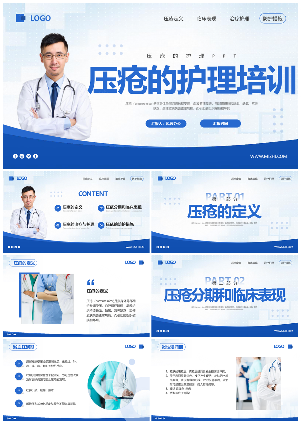 风云办公提供的蓝色简约压疮护理培训宣传动态PPT模板,下载格式为pptx,一共27页,作品中文字及图均可以修改和编辑,图片更改请在作品中右键图片并更换,文字修改请直接点击文字进行修改。