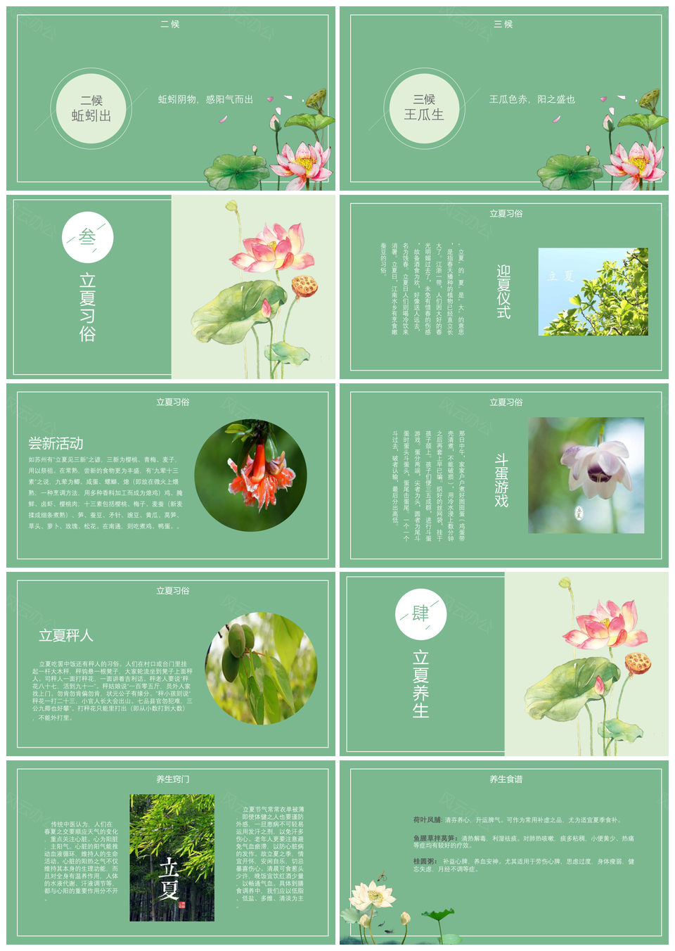 这是一张绿色小清新荷花荷叶立夏PPT模板,包含绿色、小清新、荷花、荷叶、立夏等主题内容,也可用作绿色、小清新、荷花、荷叶、立夏