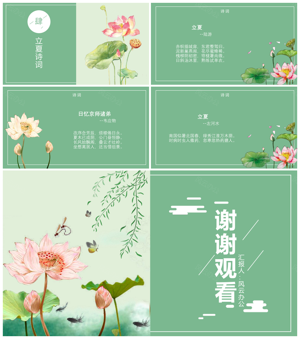 风云办公提供的绿色小清新荷花荷叶立夏PPT模板,下载格式为pptx,一共22页,作品中文字及图均可以修改和编辑,图片更改请在作品中右键图片并更换,文字修改请直接点击文字进行修改。