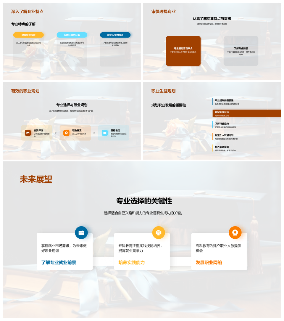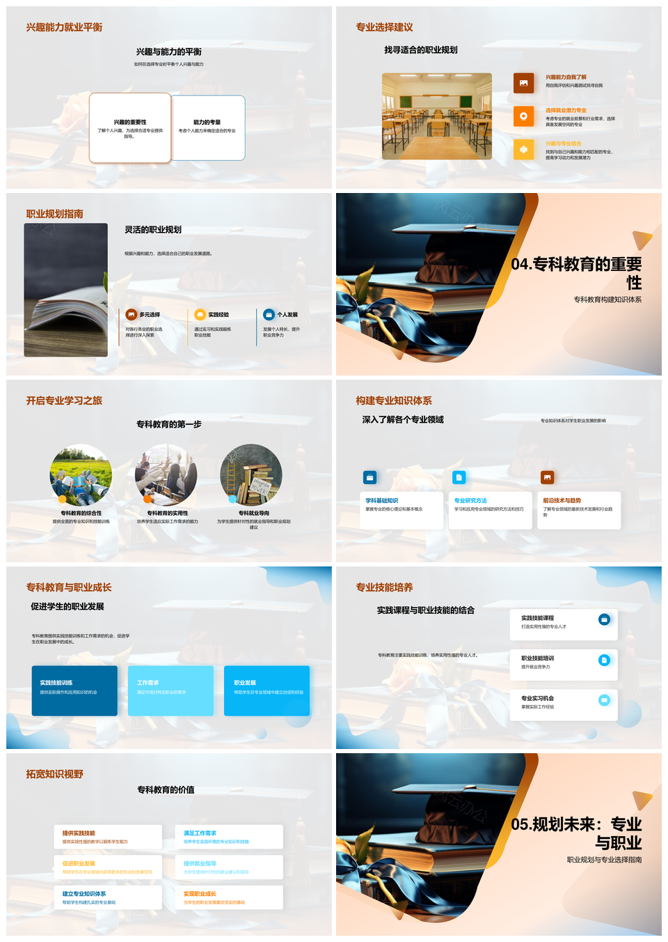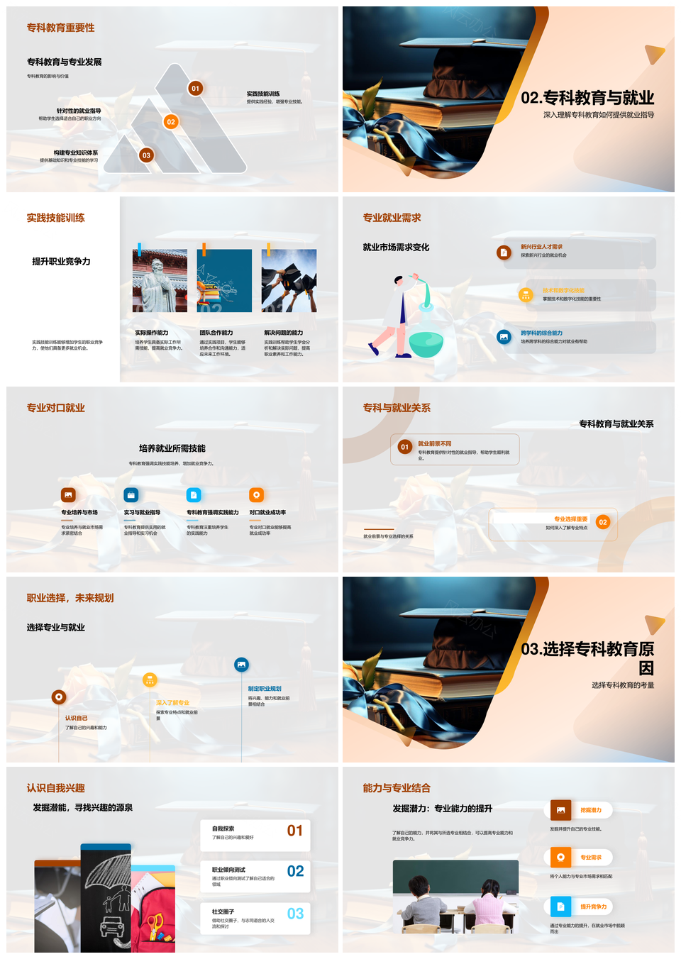 风云办公提供的专科教育职业规划与技能就业导向PPT模板,下载格式为pptx,一共33页,作品中文字及图均可以修改和编辑,图片更改请在作品中右键图片并更换,文字修改请直接点击文字进行修改。