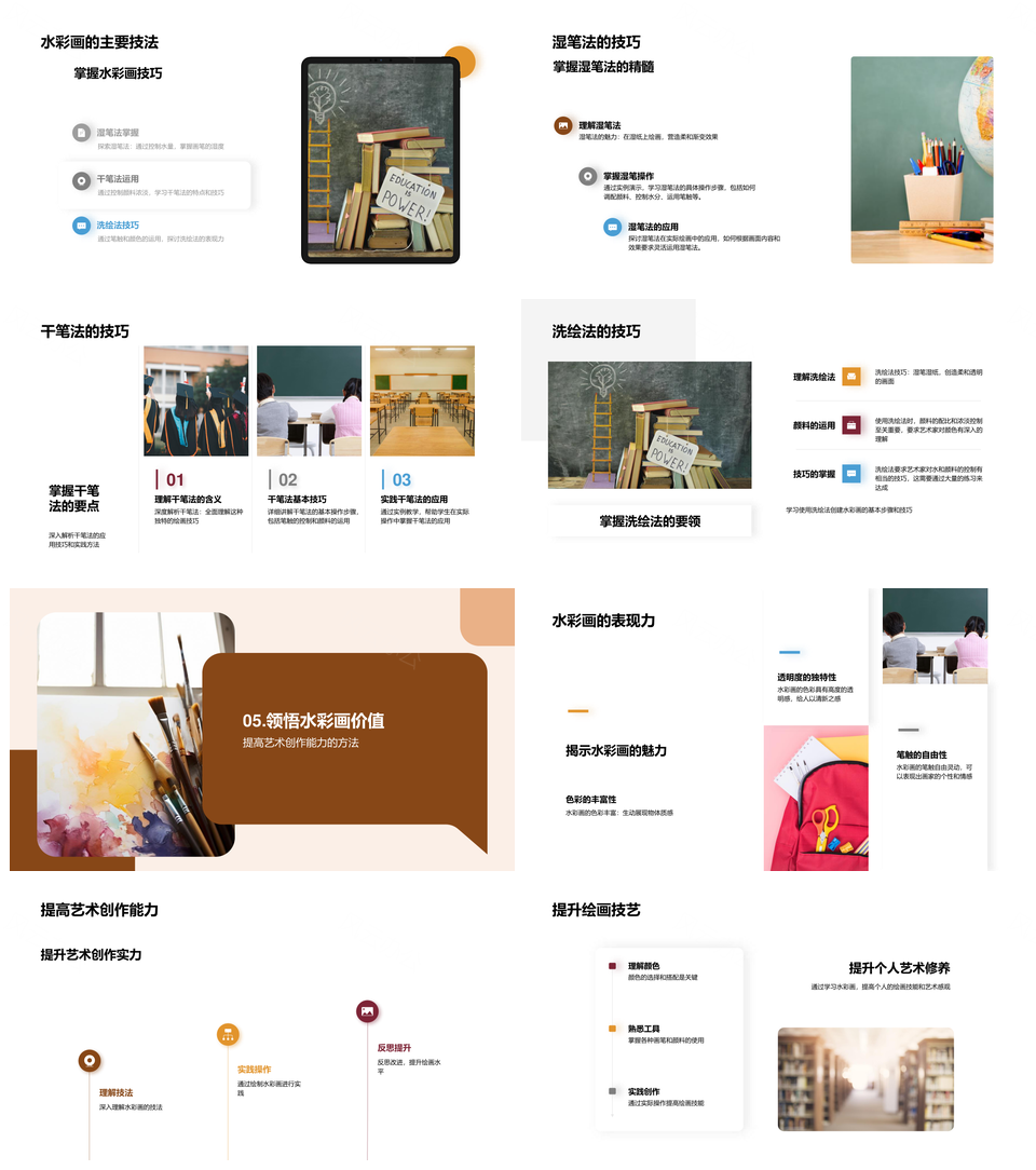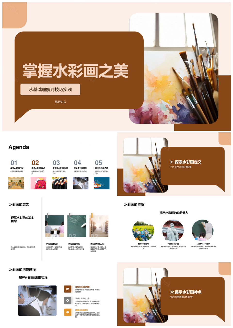 这是一张水彩画技法浓淡控水笔触选纸湿干调色实践PPT模板,包含水彩画、技法、浓淡、控水、笔触、选纸、湿干、调色、实践等主题内容,也可用作水彩画技法浓淡控水、技法浓淡控水笔触、浓淡控水笔触选纸、控水笔触选纸湿干、笔触选纸湿干调色、选纸湿干调色实践、水彩画技法浓淡、技法浓淡控水、浓淡控水笔触、控水笔触选纸、笔触选纸湿干、选纸湿干调色、湿干调色实践、水彩画技法、浓淡控水、控水笔触等PPT场景使用。 风云办公提供的水彩画技法浓淡控水笔触选纸湿干调色实践PPT模板,下载格式为pptx,一共26页,作品中文字及图均可以修改和编辑,图片更改请在作品中右键图片并更换,文字修改请直接点击文字进行修改。