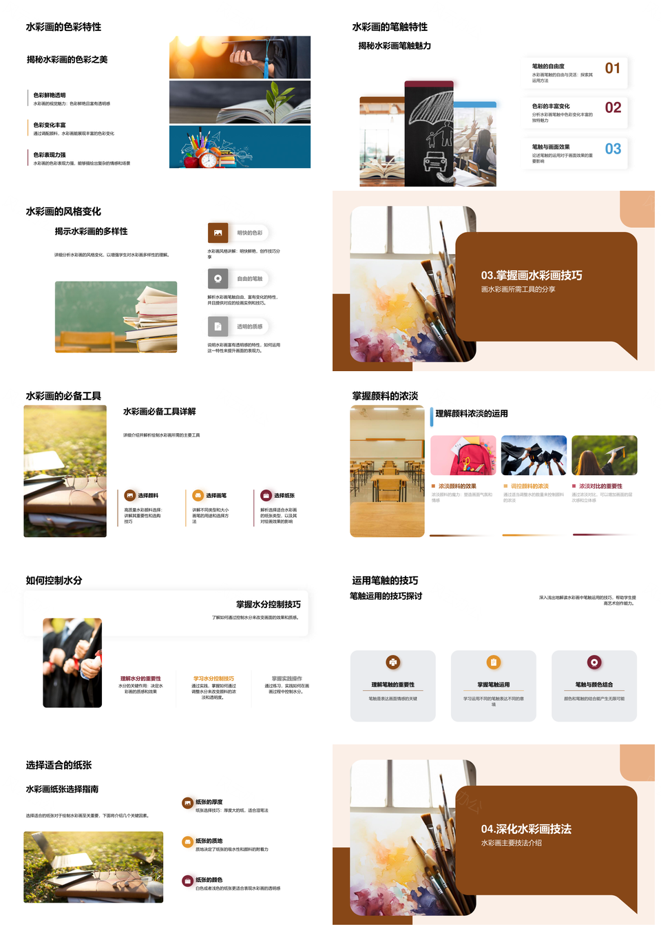 水彩画技法浓淡控水笔触选纸湿干调色实践PPT模板推荐