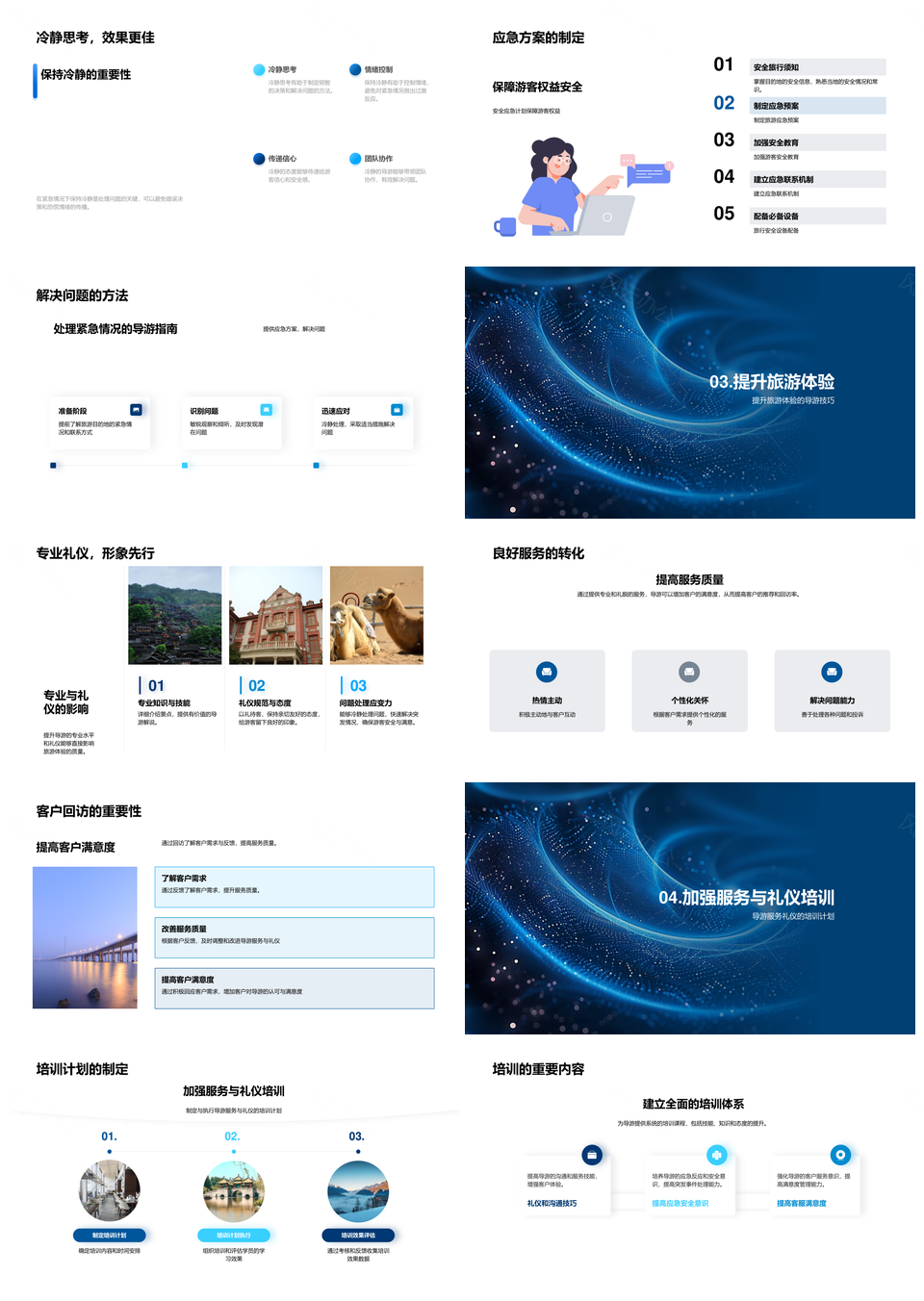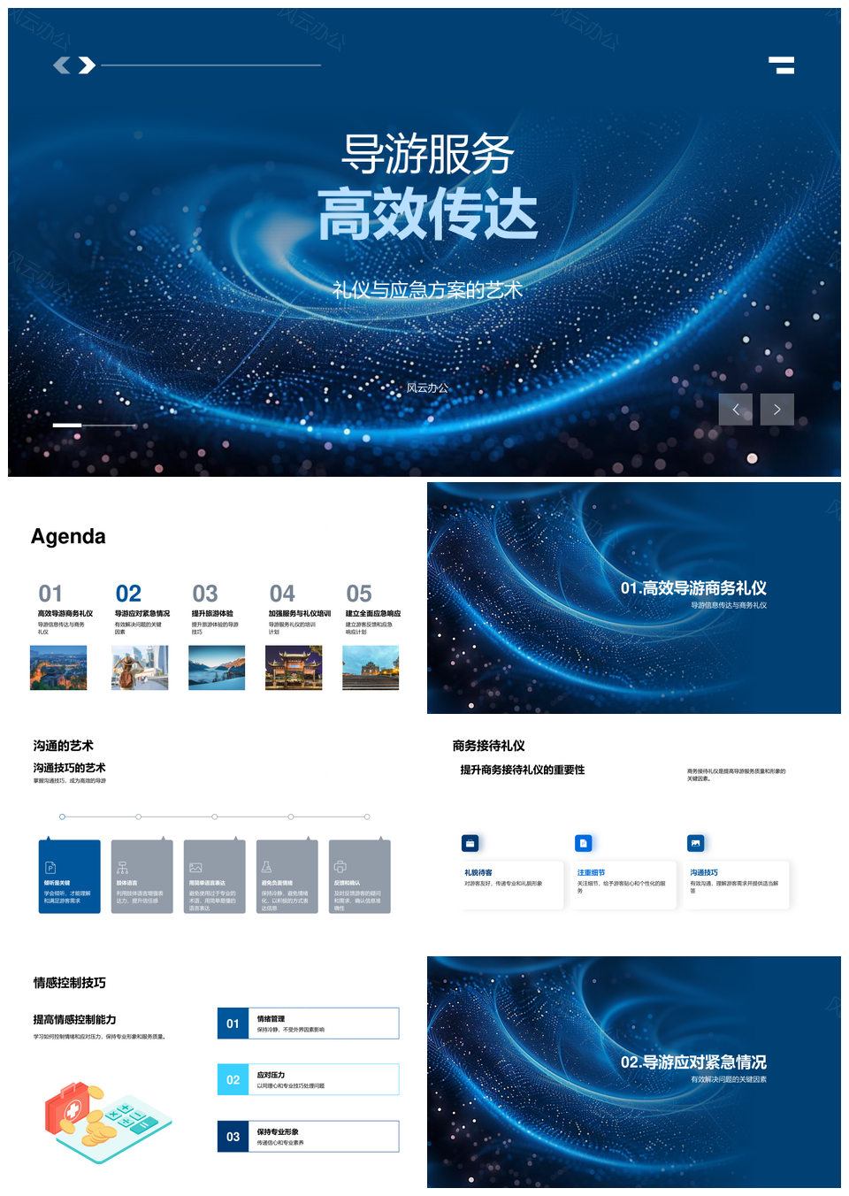 风云办公提供的导游服务培训高效沟通应急客户满意度PPT模板,下载格式为pptx,一共23页,作品中文字及图均可以修改和编辑,图片更改请在作品中右键图片并更换,文字修改请直接点击文字进行修改。