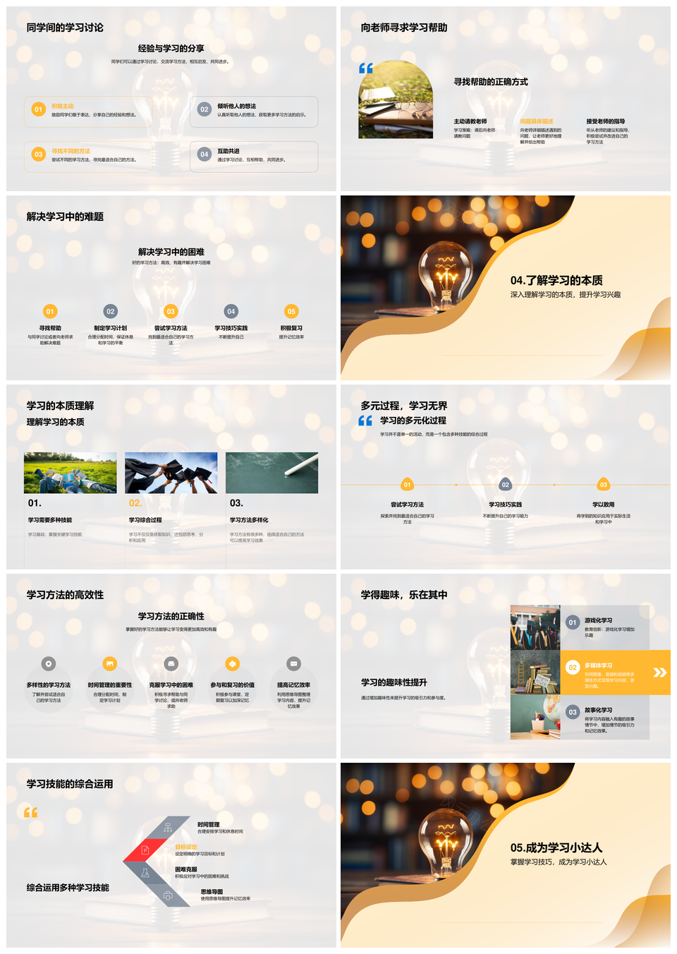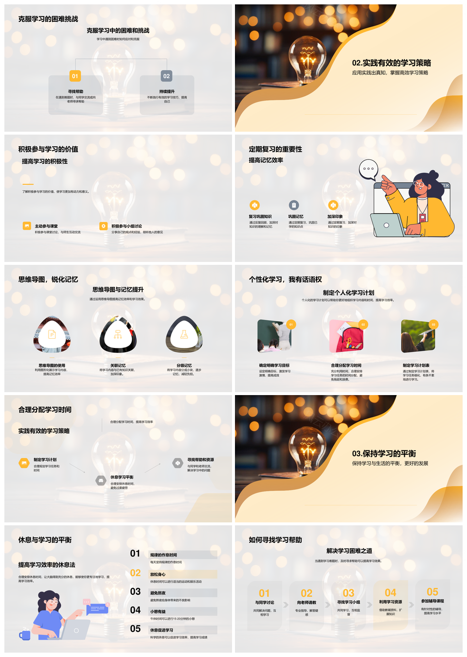这是一张高效学习攻略时间管理目标导图记忆技巧克服困难PPT模板,包含高效学习、攻略、时间管理、目标、导图、记忆技巧、克服困难等主题内容,也可用作高效学习攻略时间管理目标导图、攻略时间管理目标导图记忆技巧、时间管理目标导图记忆技巧克服困难、高效学习攻略时间管理、攻略时间管理目标导图、时间管理目标导图记忆技巧、目标导图记忆技巧克服困难、高效学习攻略、攻略时间管理、时间管理目标导图、目标导图记忆技巧、记忆技巧克服困难、高效学习时间管理目标导图、高效学习目标导图记忆技巧、攻略目标导图记忆技巧等PPT场景使用。 风云办公提供的高效学习攻略时间管理目标导图记忆技巧克服困难PPT模板,下载格式为pptx,一共33页,作品中文字及图均可以修改和编辑,图片更改请在作品中右键图片并更换,文字修改请直接点击文字进行修改。