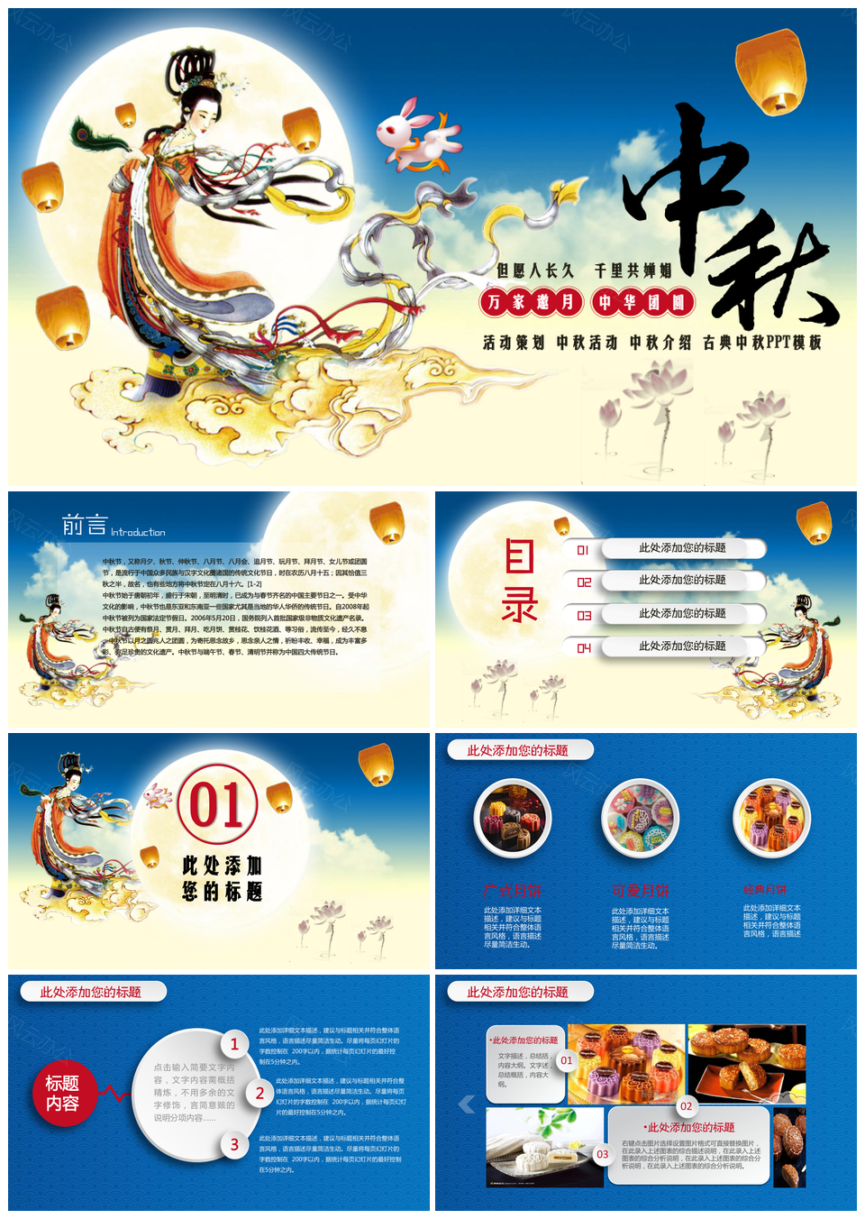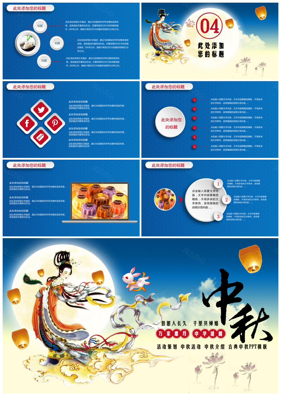 风云办公提供的深蓝色中秋节团圆活动策划PPT模板,下载格式为pptx,一共23页,作品中文字及图均可以修改和编辑,图片更改请在作品中右键图片并更换,文字修改请直接点击文字进行修改。