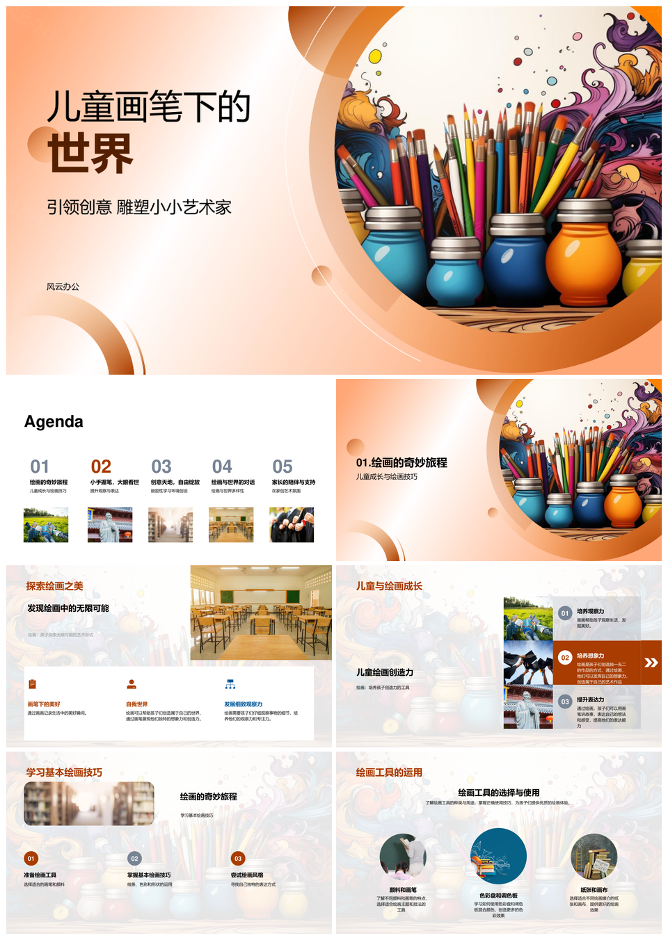 风云办公提供的童绘创培启智幼教五彩绘技PPT模板,下载格式为pptx,一共33页,作品中文字及图均可以修改和编辑,图片更改请在作品中右键图片并更换,文字修改请直接点击文字进行修改。