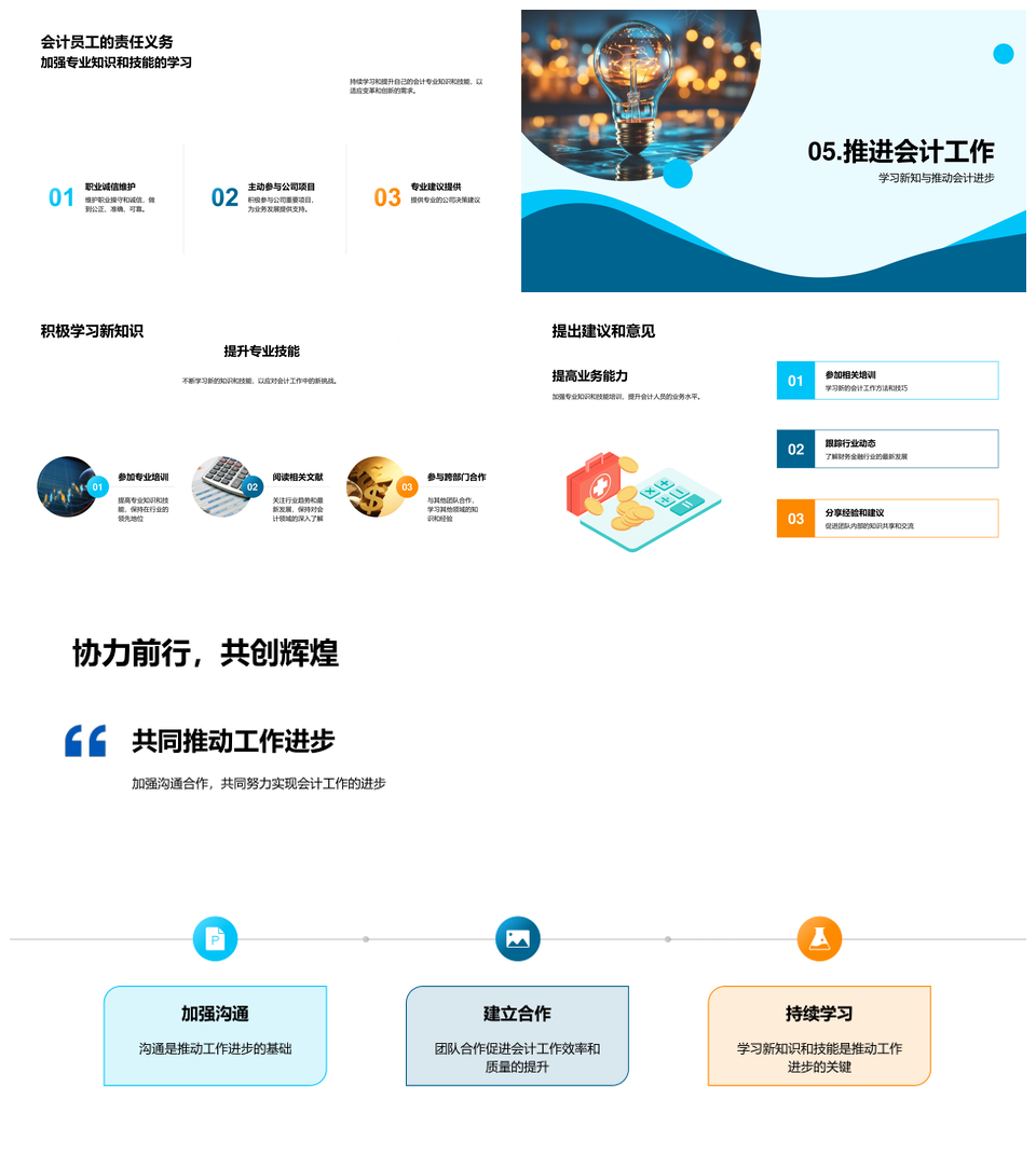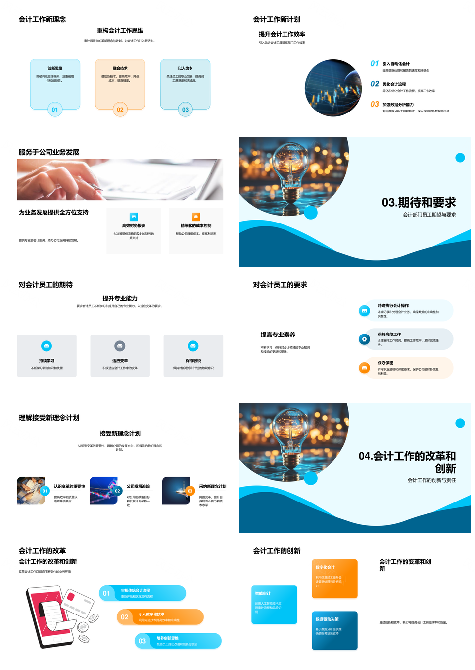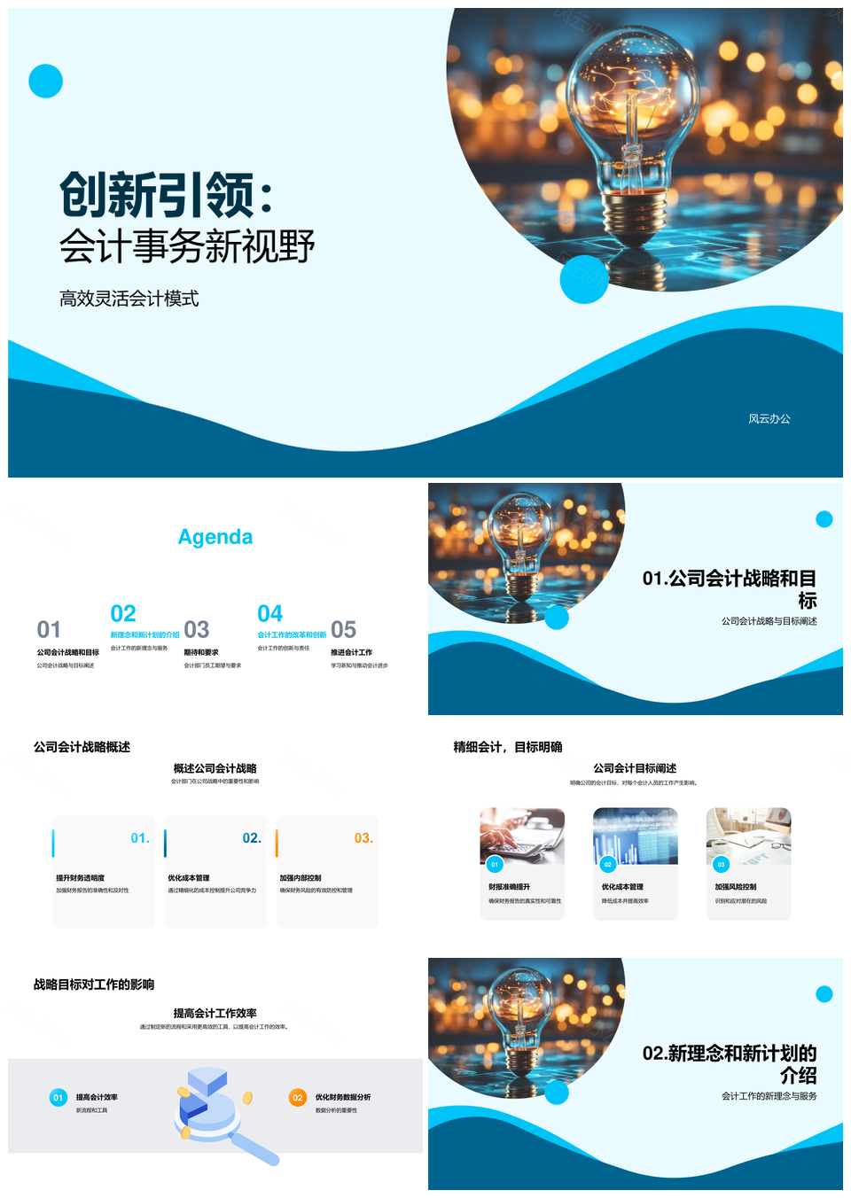风云办公提供的会计创新战略目标效率提升新理念计划PPT模板,下载格式为pptx,一共23页,作品中文字及图均可以修改和编辑,图片更改请在作品中右键图片并更换,文字修改请直接点击文字进行修改。