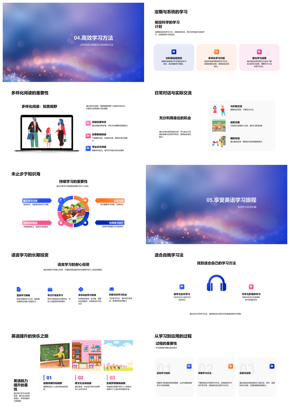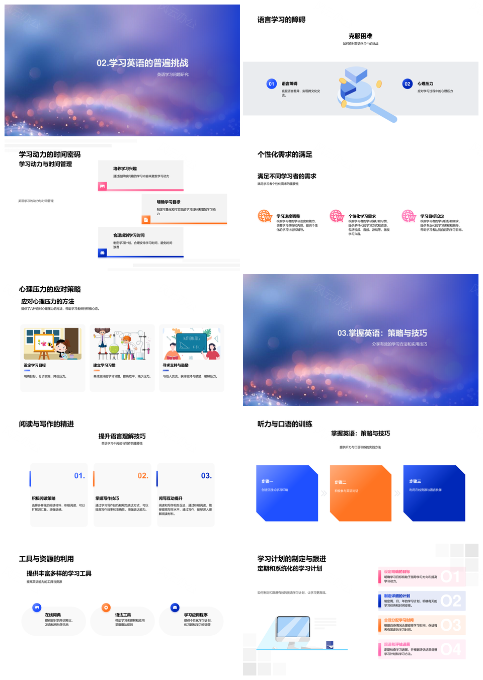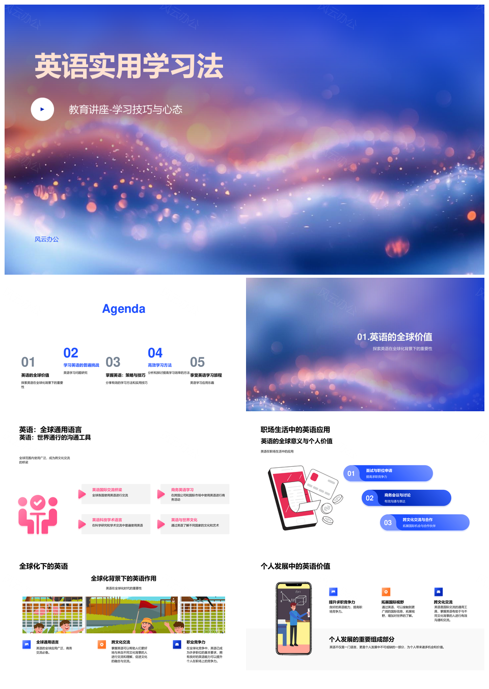 这是一张全球化英语学习法动力时间管理个性化破障读写进阶PPT模板,包含全球化、英语学习法、动力、时间管理、个性化、破障、读写进阶等主题内容,也可用作全球化英语学习法动力时间管理、动力时间管理个性化破障、英语学习法动力时间管理、时间管理个性化破障、动力时间管理个性化、个性化破障读写进阶、时间管理破障读写进阶、破障读写进阶全球化、全球化动力时间管理、英语学习法动力破障、读写进阶全球化、英语学习法读写进阶、动力时间管理、时间管理个性化、个性化破障等PPT场景使用。 风云办公提供的全球化英语学习法动力时间管理个性化破障读写进阶PPT模板,下载格式为pptx,一共28页,作品中文字及图均可以修改和编辑,图片更改请在作品中右键图片并更换,文字修改请直接点击文字进行修改。