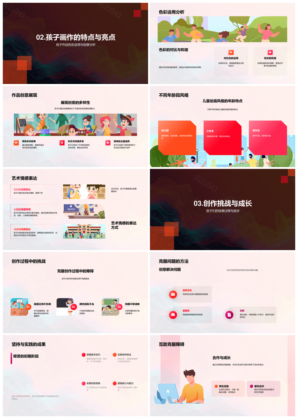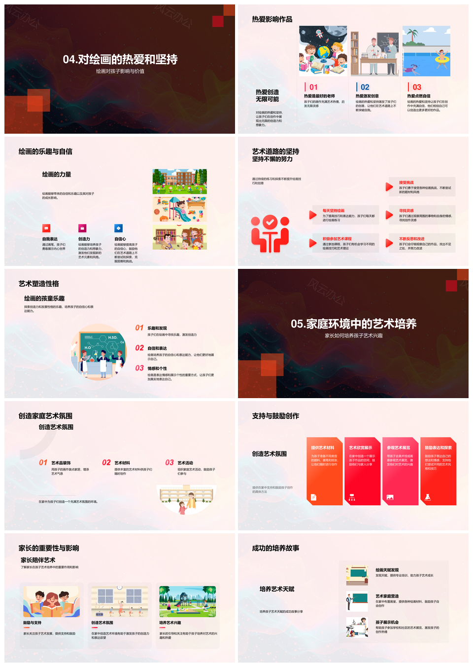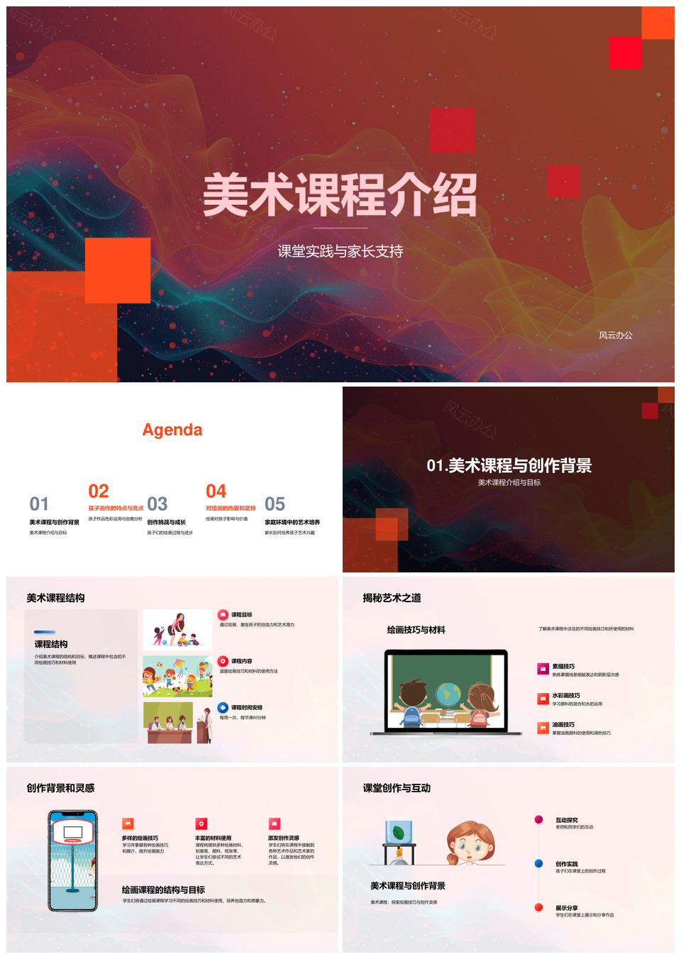 这是一张美术课程家长支持绘画技巧色彩创意风格情感表达PPT模板,包含美术课程、家长支持、绘画技巧、色彩创意、风格、情感表达等主题内容,也可用作美术课程家长支持绘画技巧、家长支持绘画技巧色彩、支持绘画技巧色彩创意、绘画技巧色彩创意风格、色彩创意风格情感表达、美术课程家长支持、家长支持绘画技巧、绘画技巧色彩创意、色彩创意风格、创意风格情感表达、美术课程家长、家长支持、绘画技巧色彩、色彩创意、创意风格等PPT场景使用。 风云办公提供的美术课程家长支持绘画技巧色彩创意风格情感表达PPT模板,下载格式为pptx,一共28页,作品中文字及图均可以修改和编辑,图片更改请在作品中右键图片并更换,文字修改请直接点击文字进行修改。
