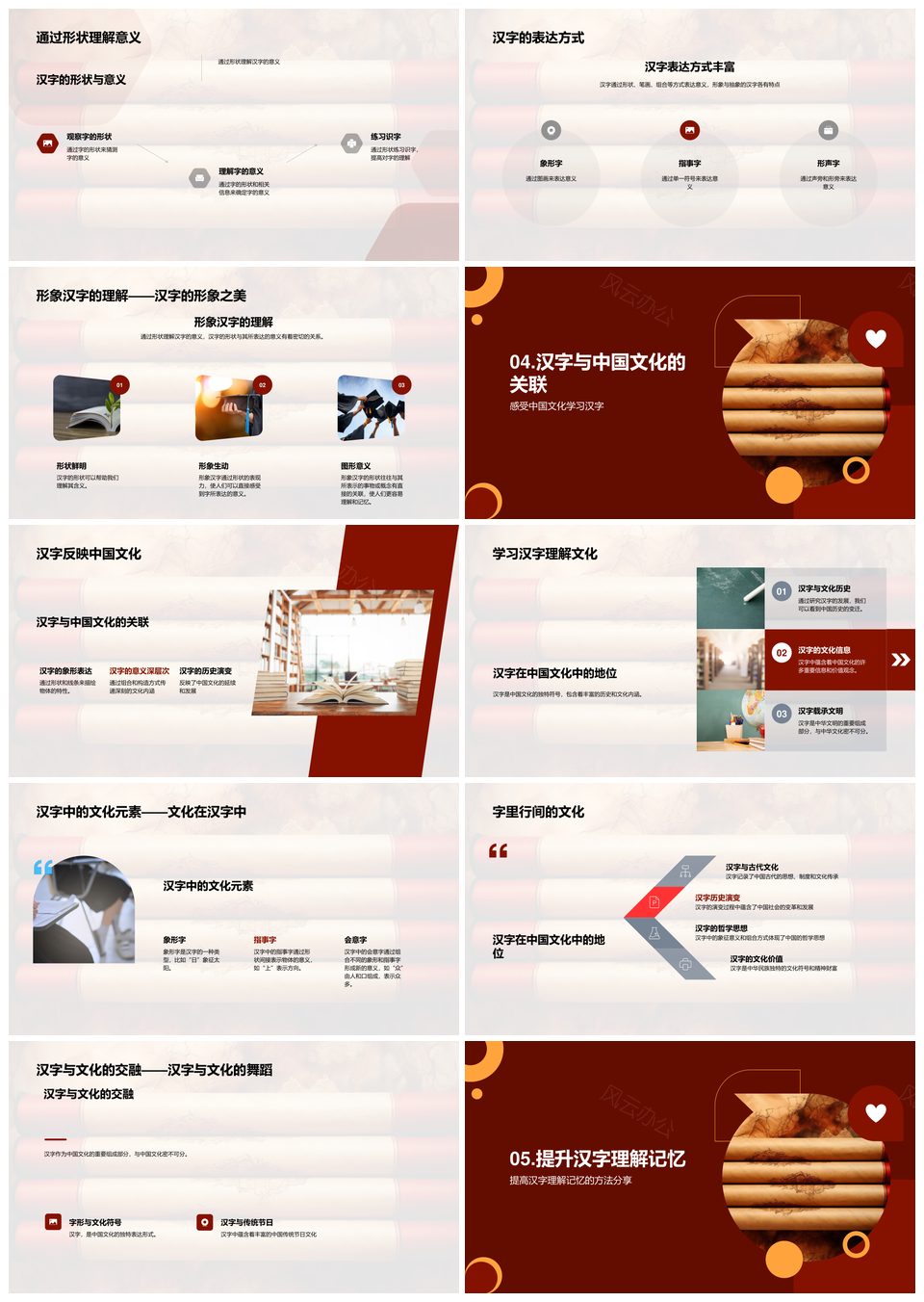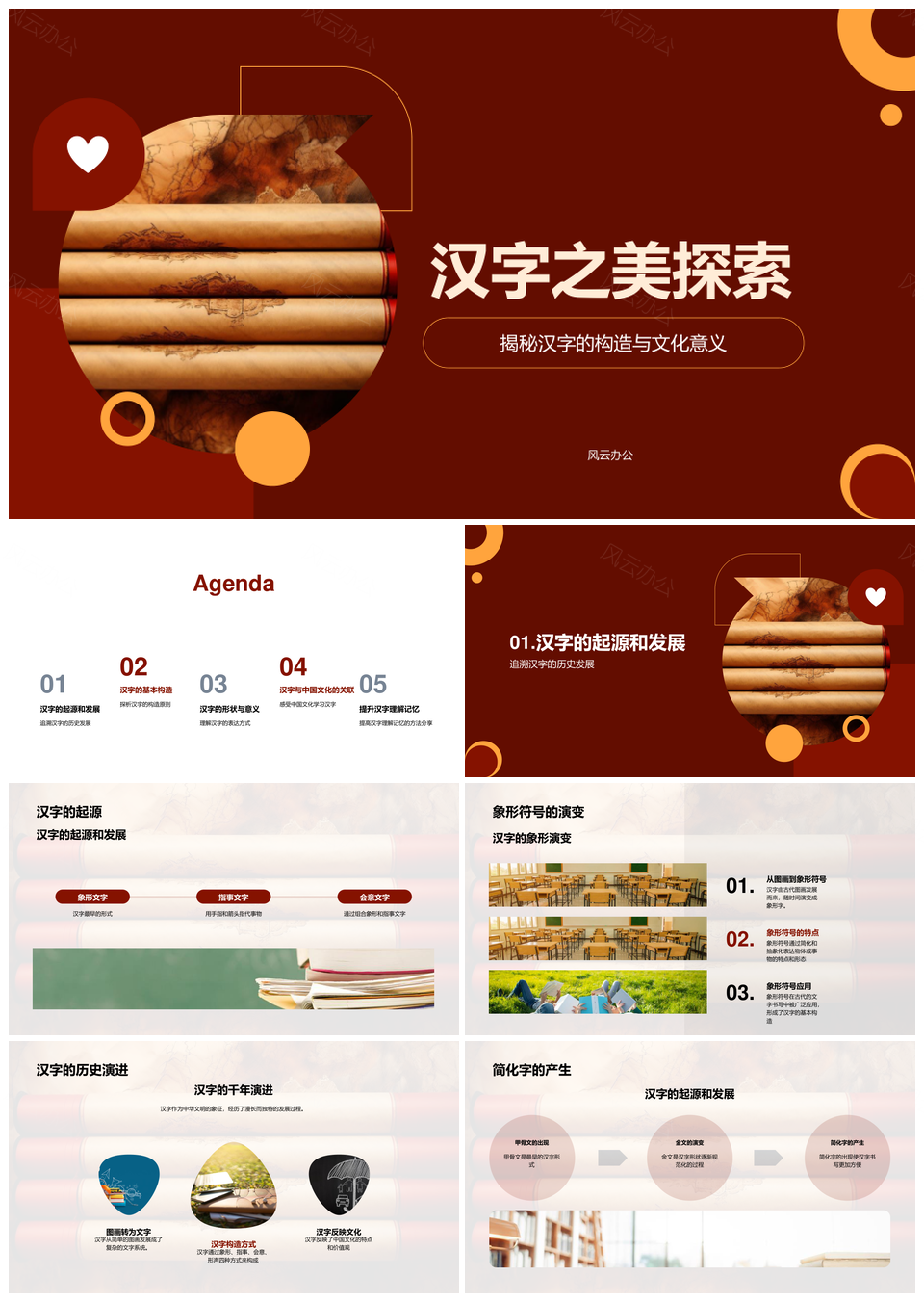 风云办公提供的汉字构造起源演变形意之美融中国文化PPT模板,下载格式为pptx,一共33页,作品中文字及图均可以修改和编辑,图片更改请在作品中右键图片并更换,文字修改请直接点击文字进行修改。