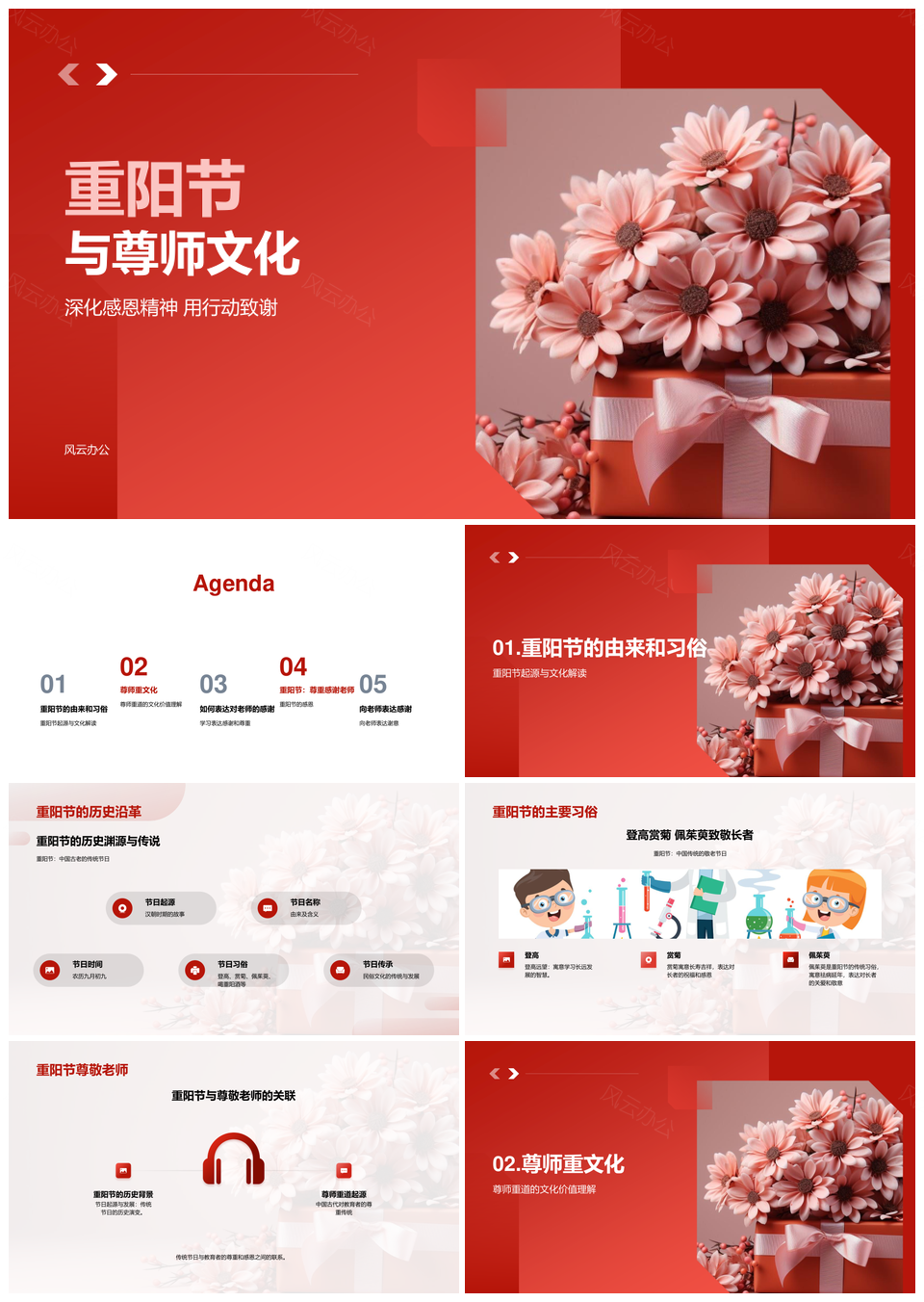 风云办公提供的重阳尊师重道感恩教育者登高赏菊PPT模板,下载格式为pptx,一共23页,作品中文字及图均可以修改和编辑,图片更改请在作品中右键图片并更换,文字修改请直接点击文字进行修改。