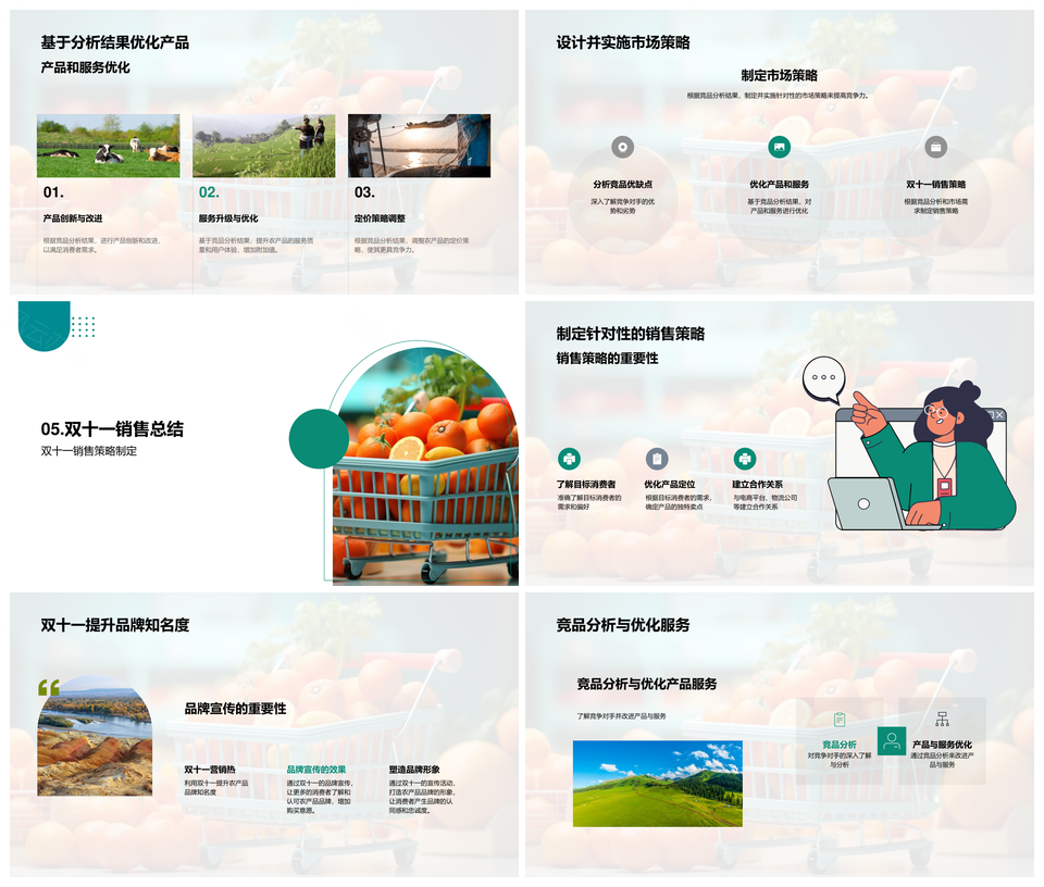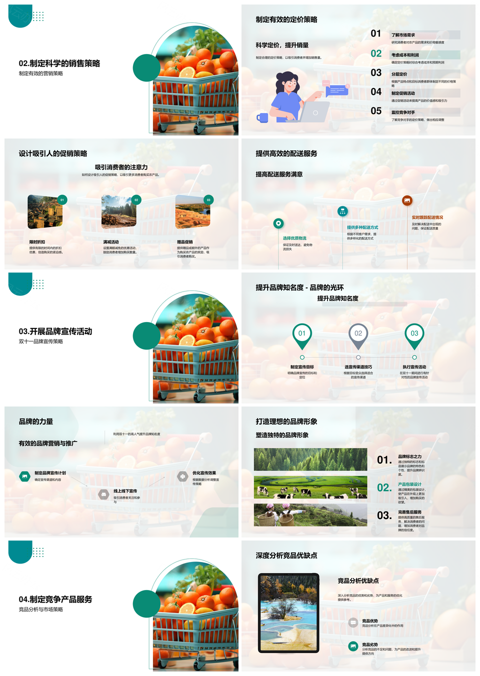 这是一张双十一农产品电商促销定价配送品牌策略PPT模板,包含双十一、农产品、电商、促销、定价、配送、品牌、策略等主题内容,也可用作双十一农产品电商促销定价配送品牌策略、农产品电商促销定价配送品牌策略、双十一促销定价配送品牌策略、促销定价配送品牌策略、双十一农产品促销定价配送、农产品促销定价配送品牌、电商促销定价配送品牌、双十一电商促销定价配送、农产品电商促销定价、双十一促销定价配送、电商促销定价配送、促销定价配送品牌、双十一农产品电商、农产品促销定价、促销定价配送、定价配送品牌等PPT场景使用。 风云办公提供的双十一农产品电商促销定价配送品牌策略PPT模板,下载格式为pptx,一共24页,作品中文字及图均可以修改和编辑,图片更改请在作品中右键图片并更换,文字修改请直接点击文字进行修改。