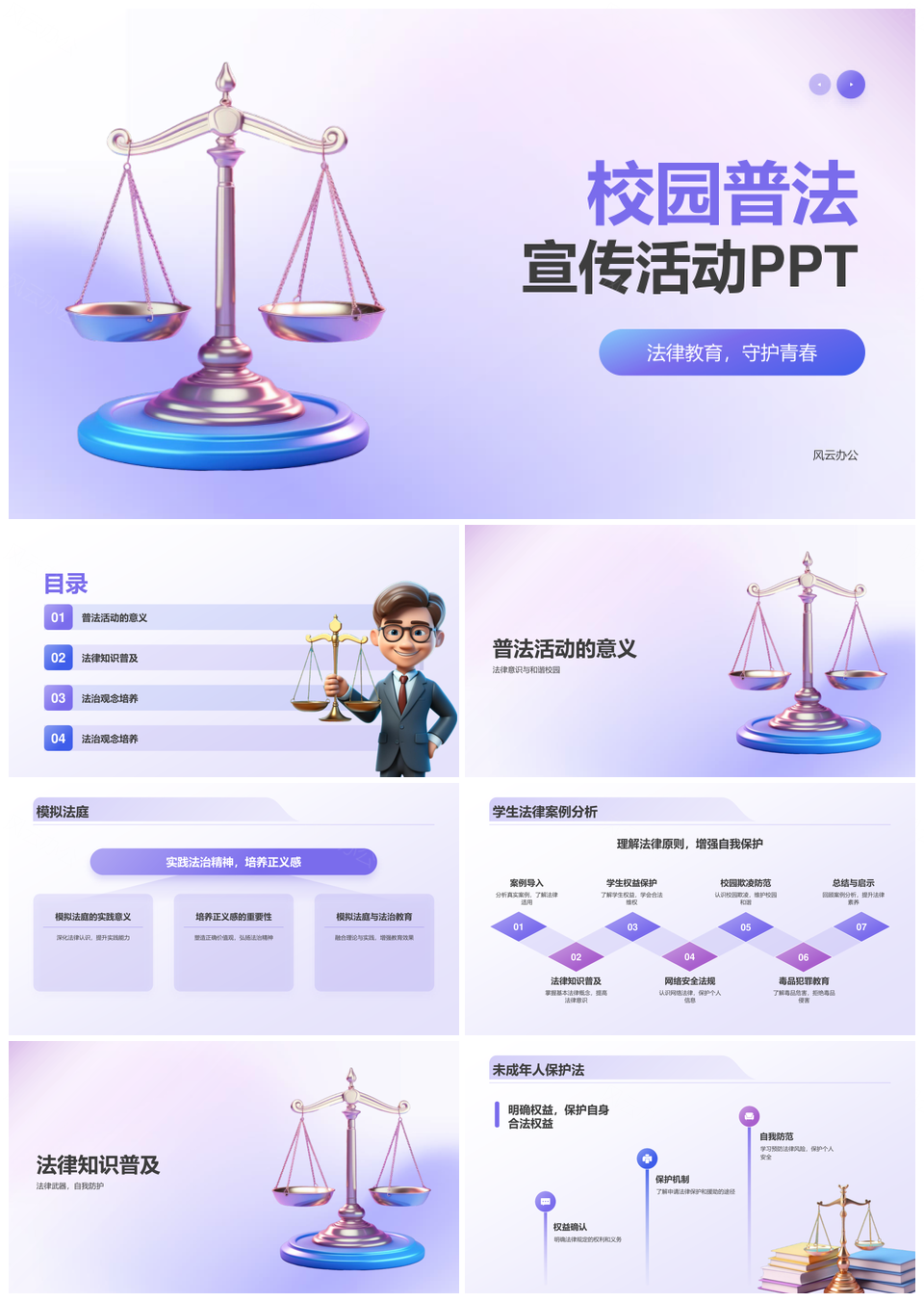 风云办公提供的校园法律读书普法宣传天平活动PPT模板,下载格式为pptx,一共16页,作品中文字及图均可以修改和编辑,图片更改请在作品中右键图片并更换,文字修改请直接点击文字进行修改。