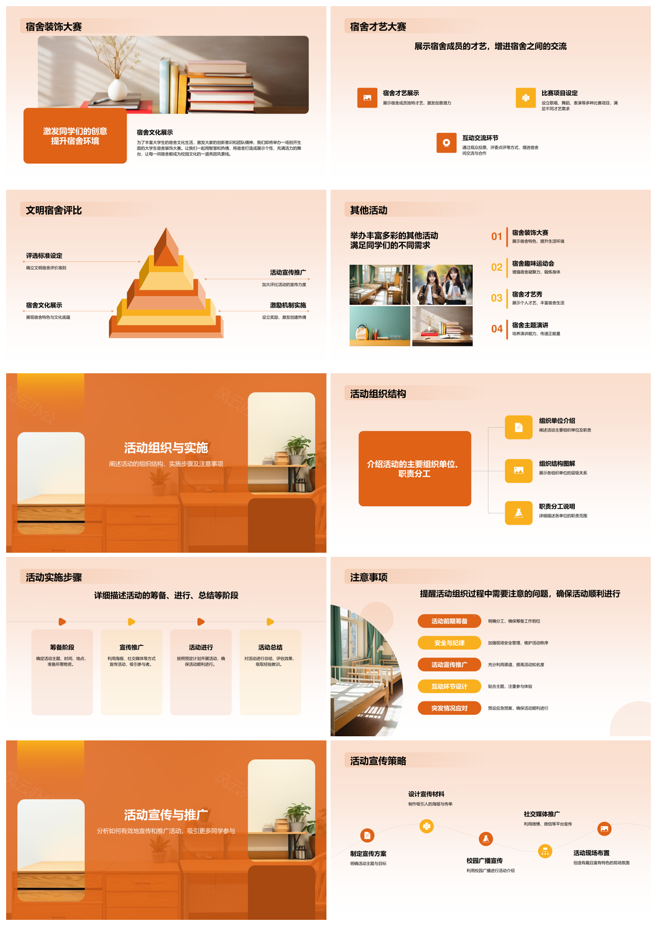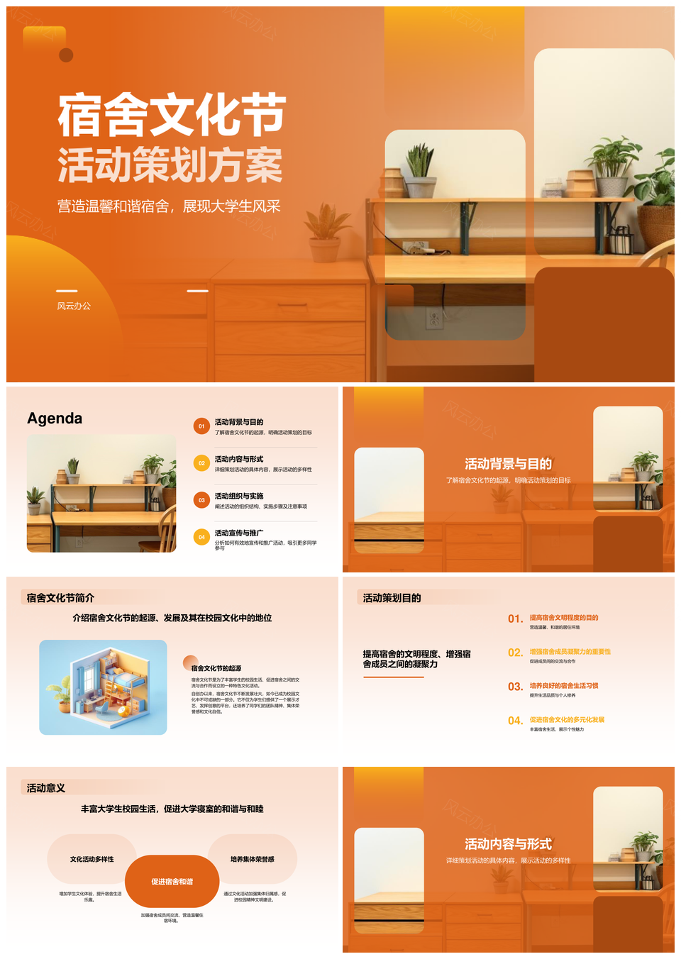 风云办公提供的宿舍文化节装饰才艺文明评比活动策划PPT模板,下载格式为pptx,一共20页,作品中文字及图均可以修改和编辑,图片更改请在作品中右键图片并更换,文字修改请直接点击文字进行修改。