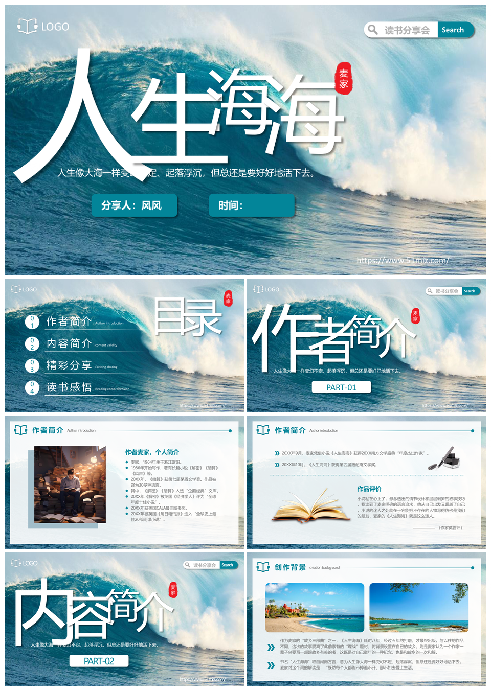 人生海海蓝海实拍读书分享笔记书籍推荐作家故事PPT模板推荐