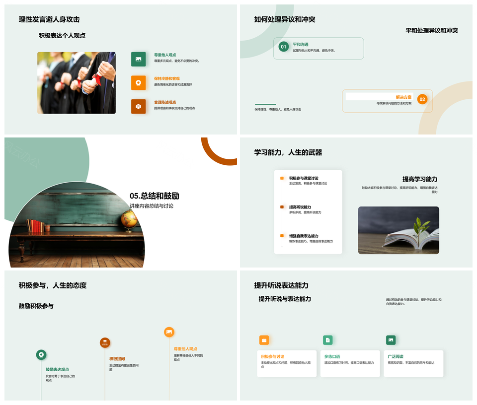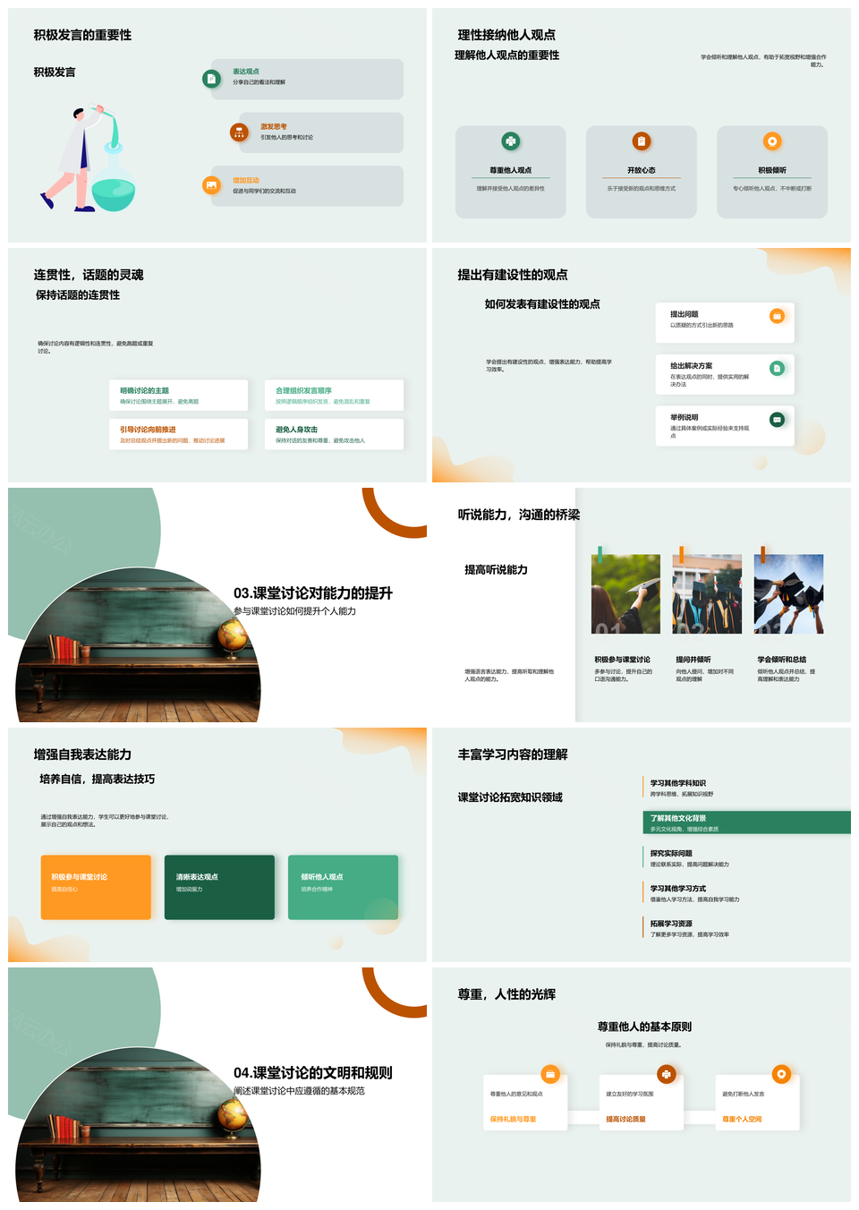 这是一张课堂讨论高效沟通知识普及积极理性建设观点PPT模板,包含课堂讨论、高效沟通、知识普及、积极理性、建设观点等主题内容,也可用作课堂讨论高效沟通知识普及积极理性建设观点、课堂讨论高效沟通知识普及、高效沟通知识普及积极理性、知识普及积极理性建设观点、课堂讨论高效沟通积极理性、高效沟通积极理性建设观点、课堂讨论知识普及积极理性、知识普及积极理性建设、高效沟通知识普及建设观点、课堂讨论积极理性建设观点、高效沟通知识普及积极、知识普及积极理性建设、课堂讨论高效沟通、高效沟通知识普及、知识普及积极理性、积极理性建设观点等PPT场景使用。 风云办公提供的课堂讨论高效沟通知识普及积极理性建设观点PPT模板,下载格式为pptx,一共24页,作品中文字及图均可以修改和编辑,图片更改请在作品中右键图片并更换,文字修改请直接点击文字进行修改。