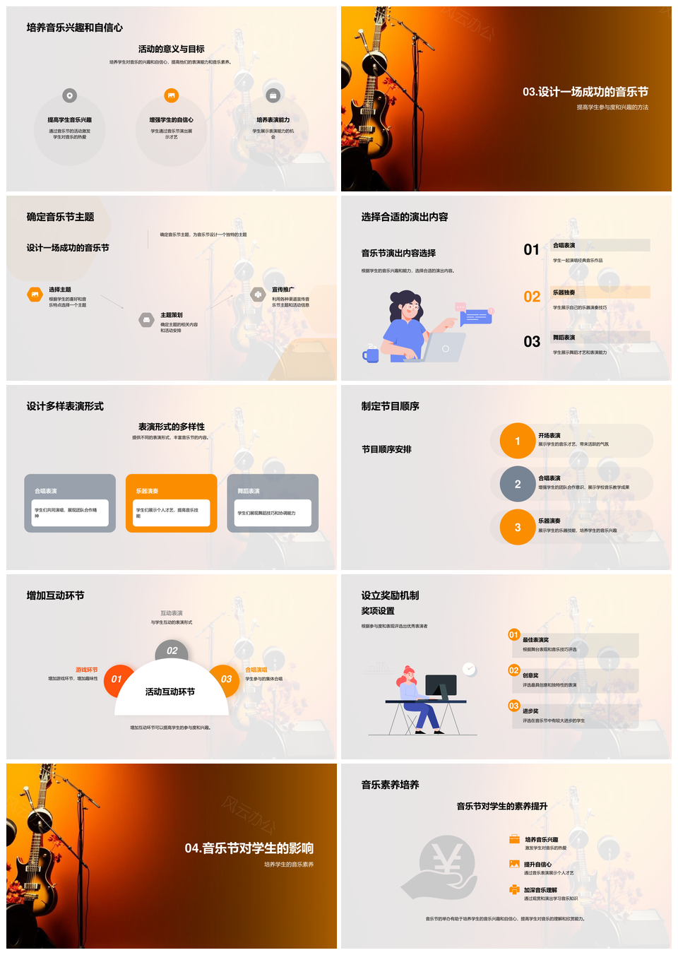 这是一张学校音乐节教师培训师策划乐器活动设计PPT模板,包含学校、音乐节、教师、培训师、策划、乐器、活动、设计等主题内容,也可用作学校音乐节教师培训师、学校音乐节策划活动、音乐节教师培训师策划、教师培训师策划乐器、培训师策划乐器活动、策划乐器活动设计、音乐节教师活动设计、学校音乐节活动设计、教师培训师活动设计、学校策划乐器活动、音乐节策划活动设计、培训师乐器活动设计、策划活动设计培训师、音乐节培训师策划活动、学校教师策划活动等PPT场景使用。 风云办公提供的学校音乐节教师培训师策划乐器活动设计PPT模板,下载格式为pptx,一共24页,作品中文字及图均可以修改和编辑,图片更改请在作品中右键图片并更换,文字修改请直接点击文字进行修改。